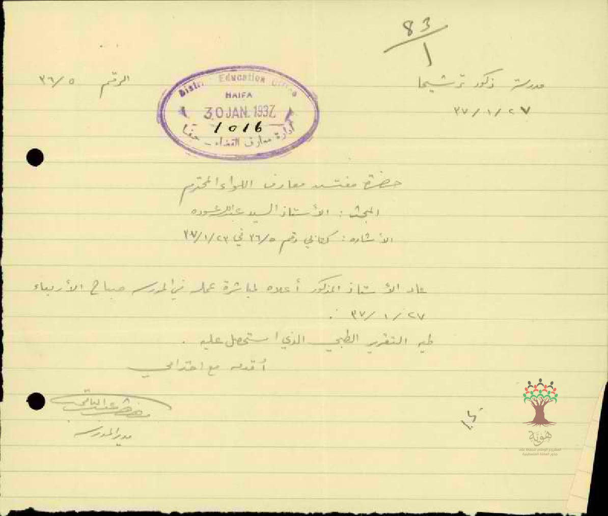 رسالة من مدير مدرسة ترشيحا الى مفتش المعارف بخصوص عودة المعلم عبد الله عودة الى العمل