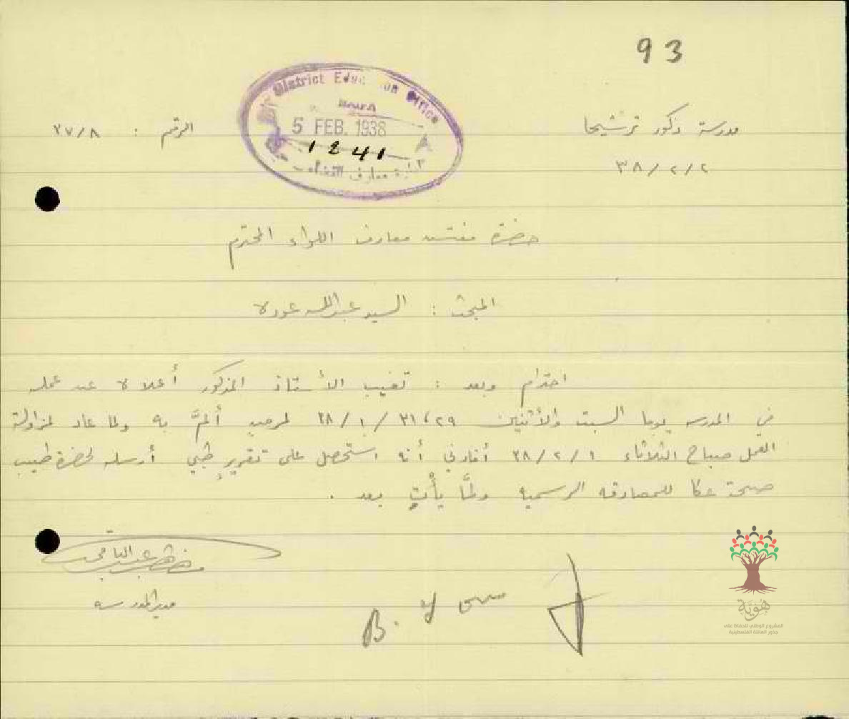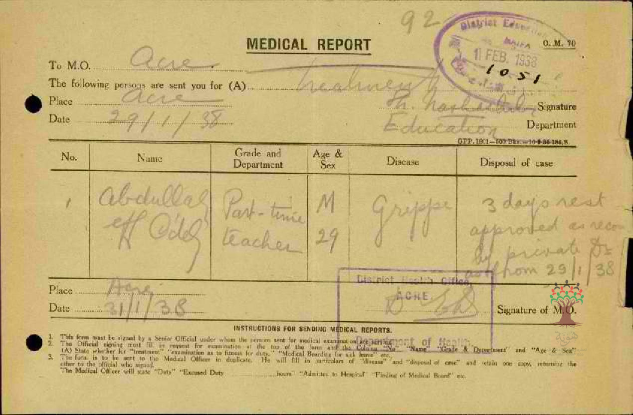 رسالة من مدير مدرسة ترشيحا الى مفتش المعارف بخصوص تغيب المعلم عبد الله عودة مرفقة بالتقرير الطبي