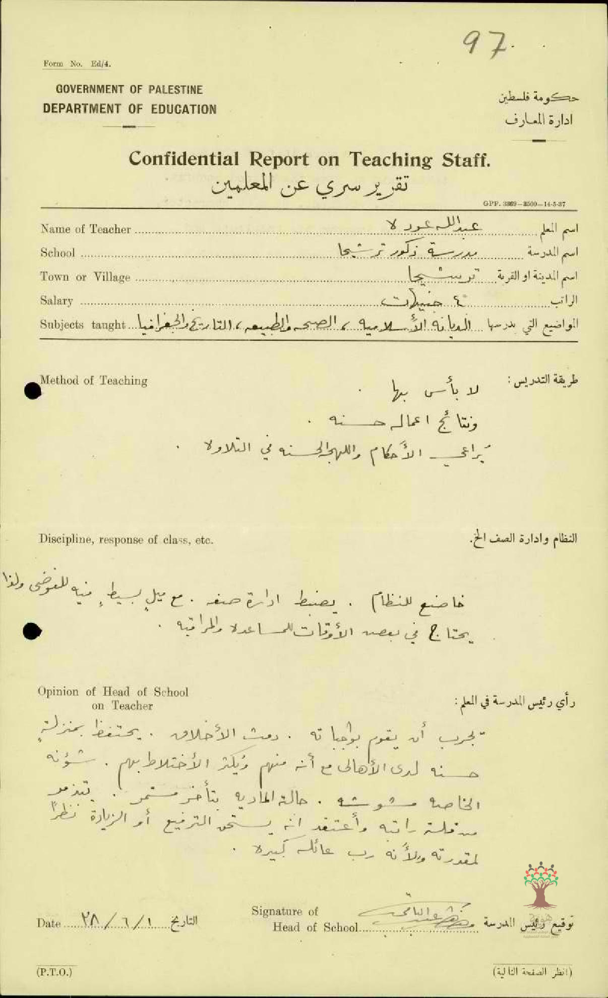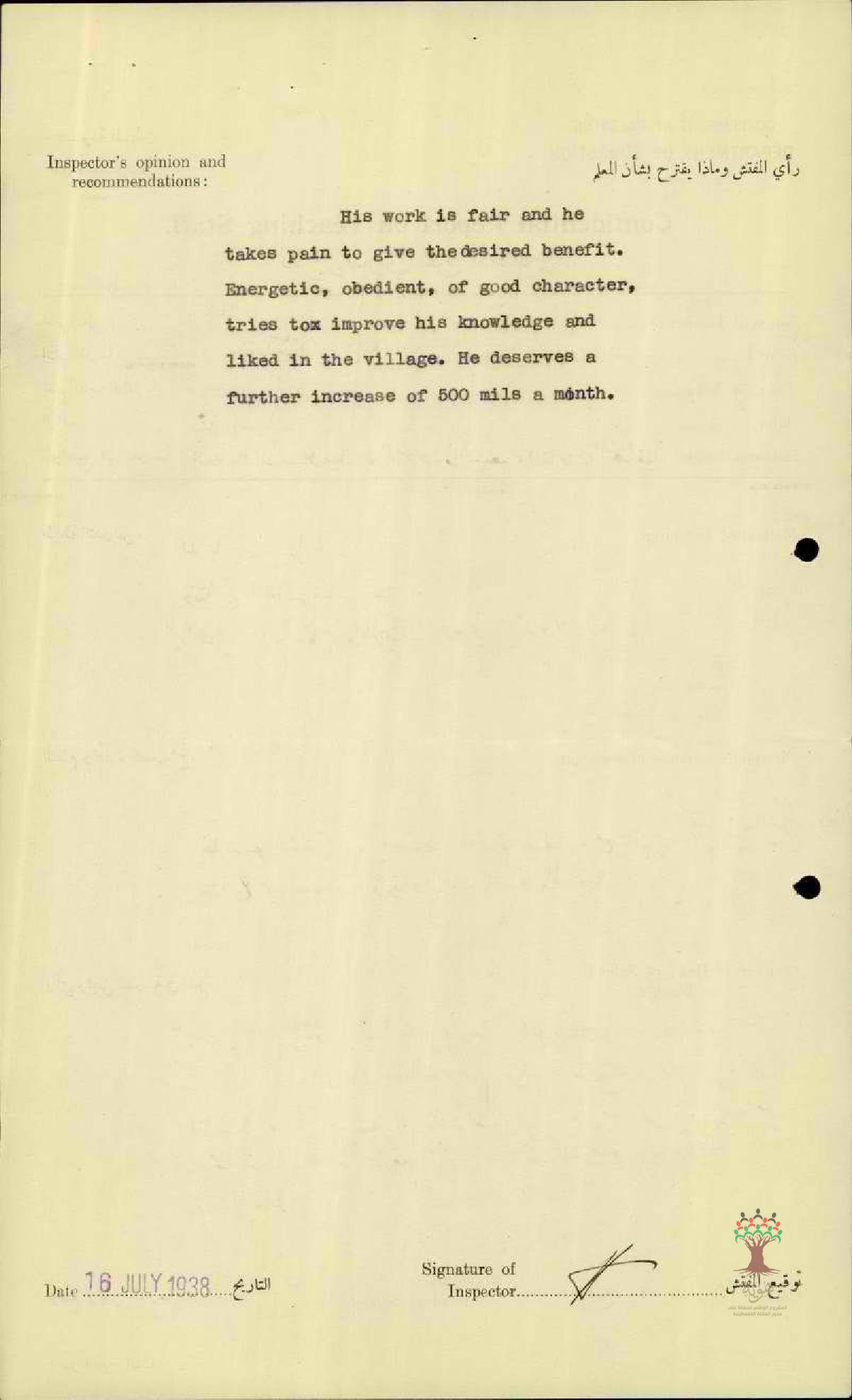 تقرير تفصيلي عن أداء المعلم عبد الله عودة في مدرسة ترشيحا للذكور سنة 1938
