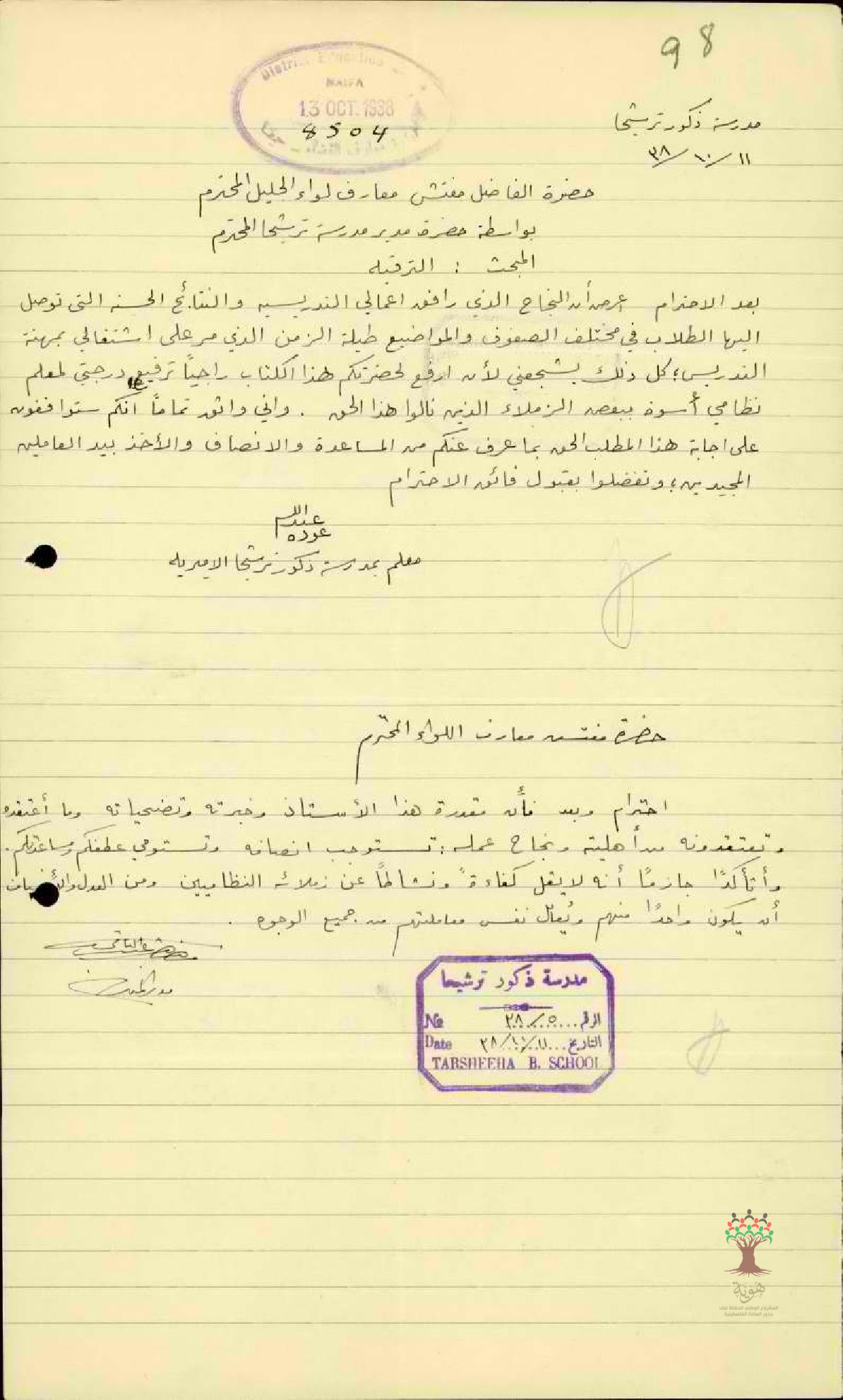 رسالة من المعلم عبد الله عودة الى مفتش الكعارف يطلب ترقيته