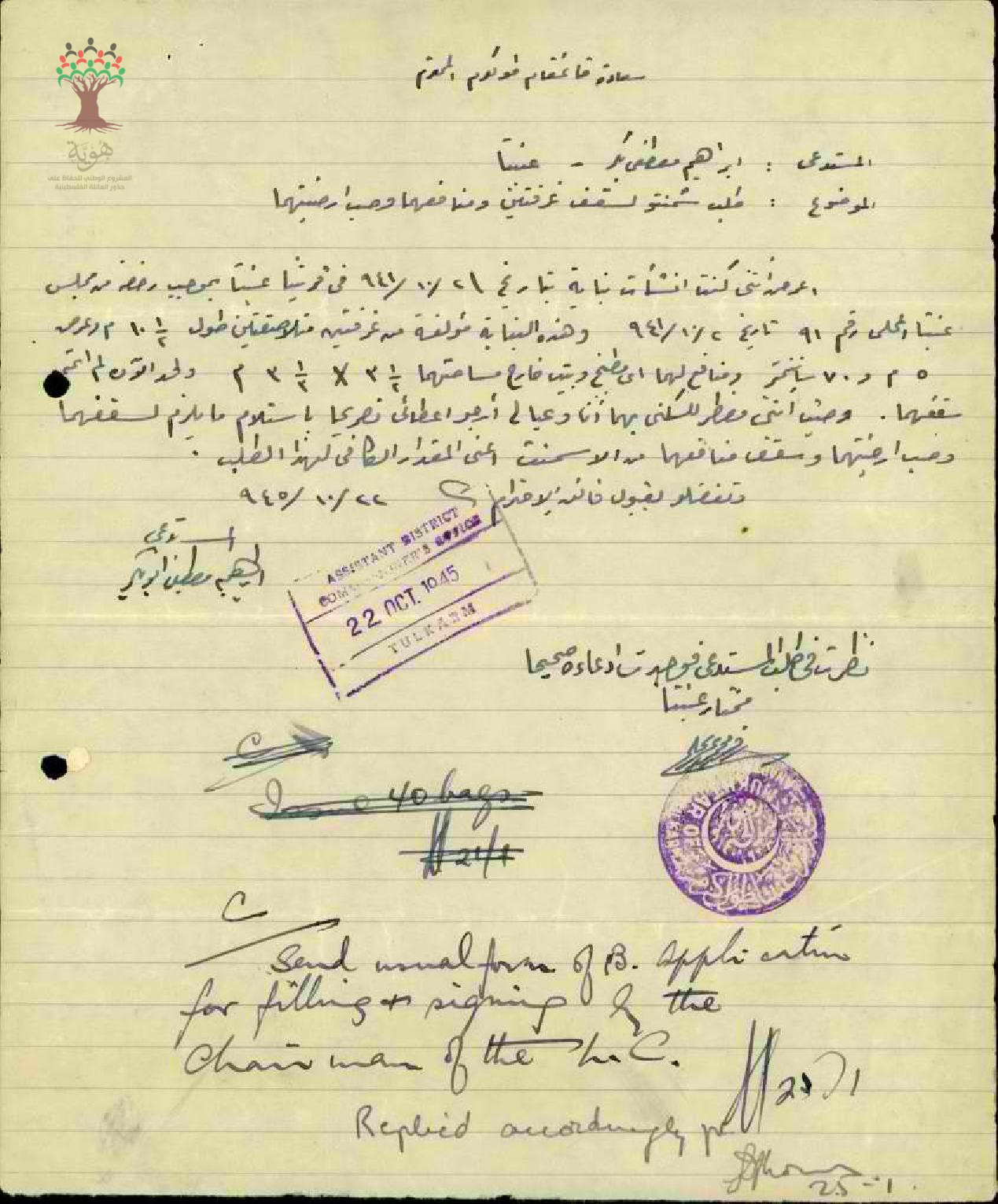 رسالة من ابراهيم مصطفى بكر إلى قائمقام طولكرم يطلب رخصة لاتمام بناء مسكنه