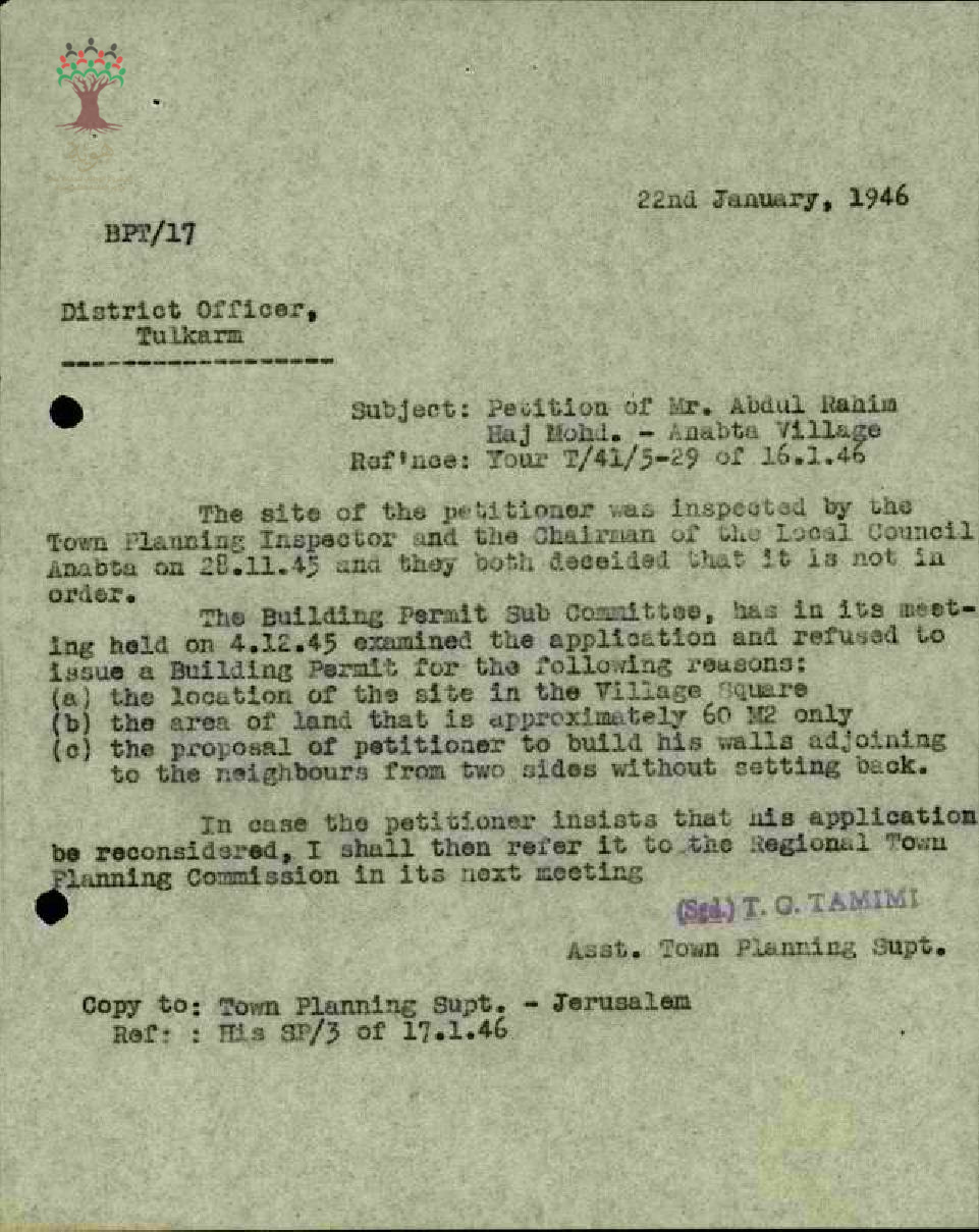 رسالة من مساعد مشرف تخطيط المدن إلى قائمقام طولكرم يخبره برفض طلب رخصة بناء السيد عبد الرحيم الحاج محمد يوسف