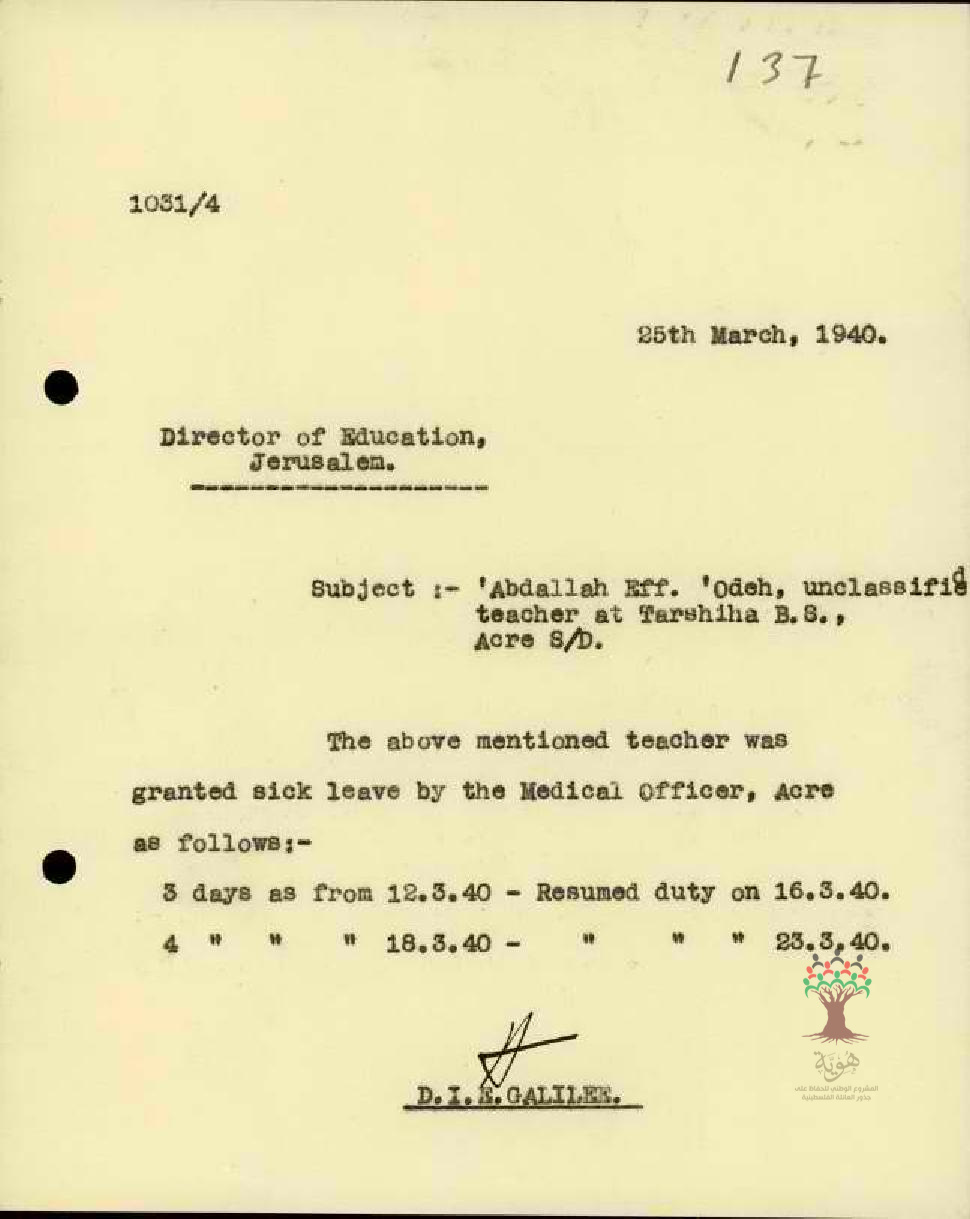 رسالة من مفتش المعارف الى مدير المعارف بخصوص تغيب المعلم عبد الله عودة وعودته الى العمل