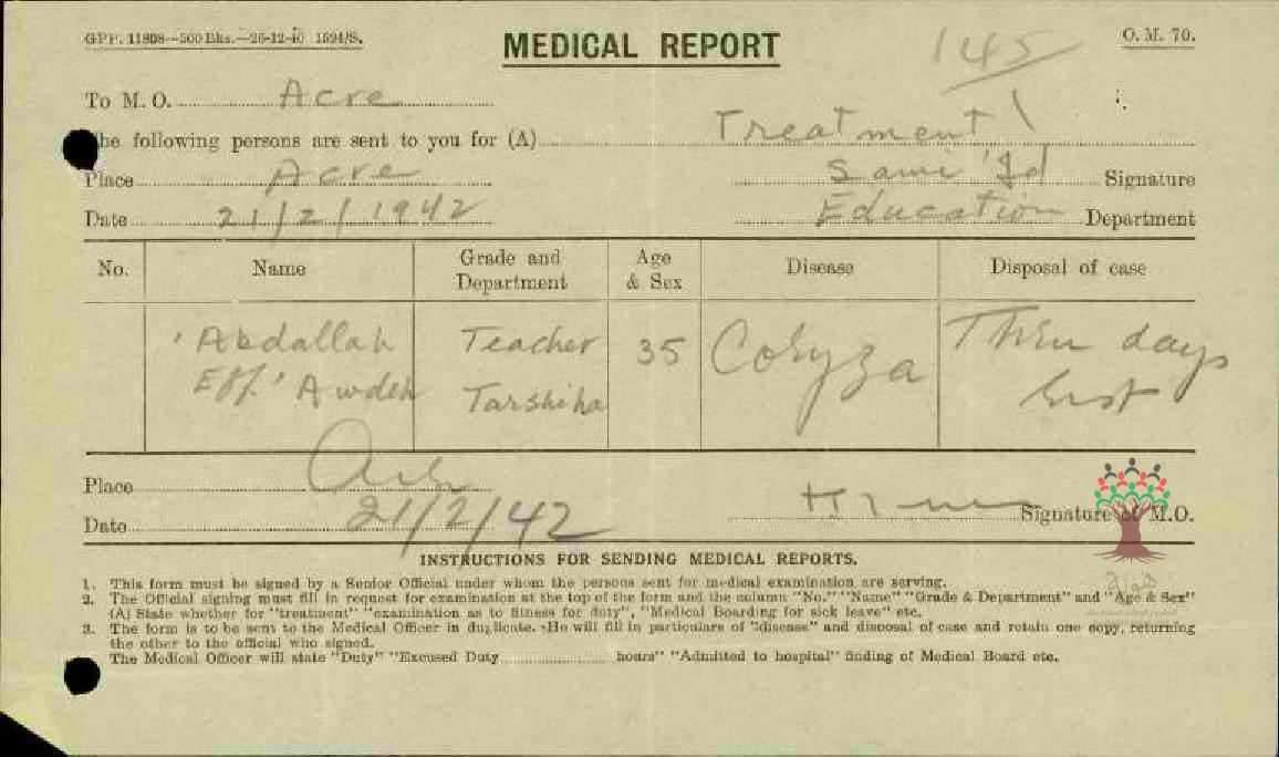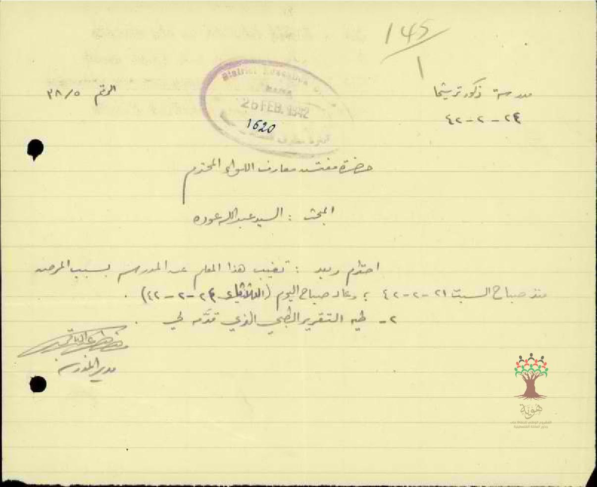 رسالة من مدير مدرسة ترشيحا الى مفتش المعارف بخصوص تغيب المعلم عبد الله عودة بسبب المرض مرفقة بتقرير طبي