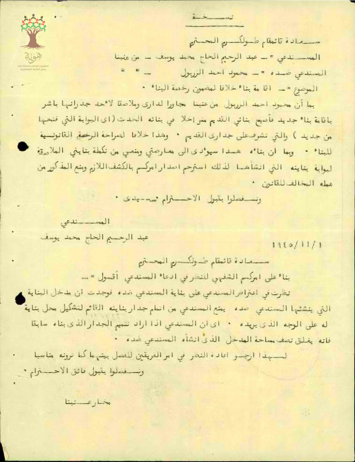 رسالة من عبد الرحيم الحاج محمد يوسف إلى قائمقام طولكرم ضد محمود أحمد الزربول