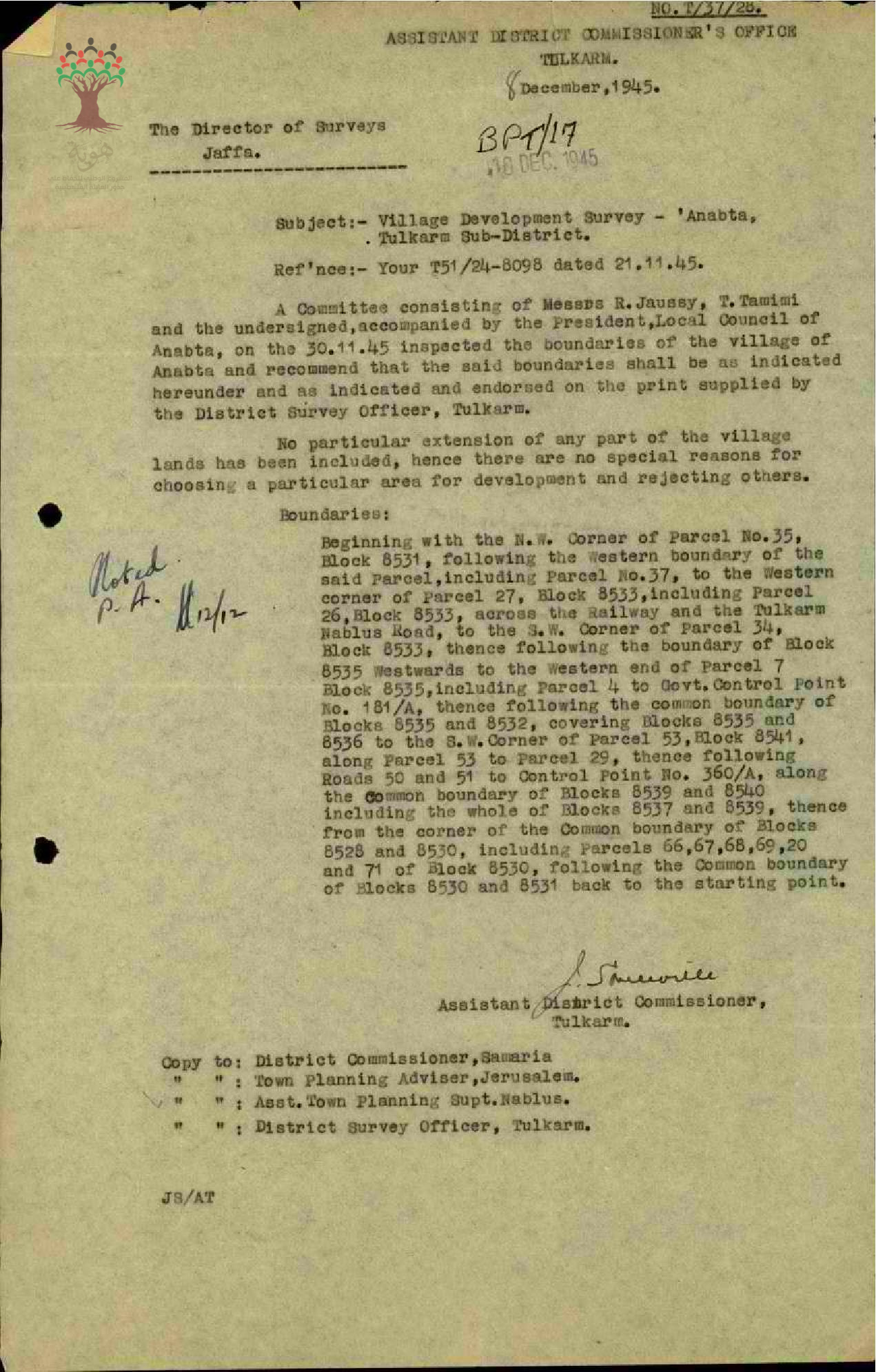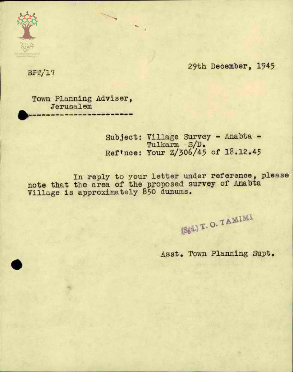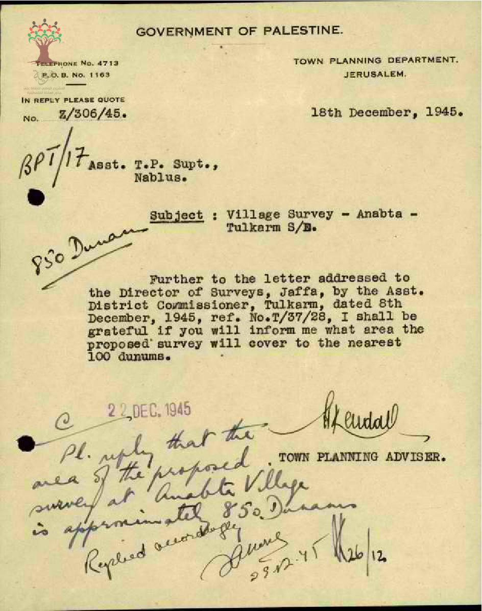 رسالة من مساعد مشرف تنظيم المدن إلى مشرف تنظيم المدن يخبره بمساحة قرية عنبتا 850 دونم