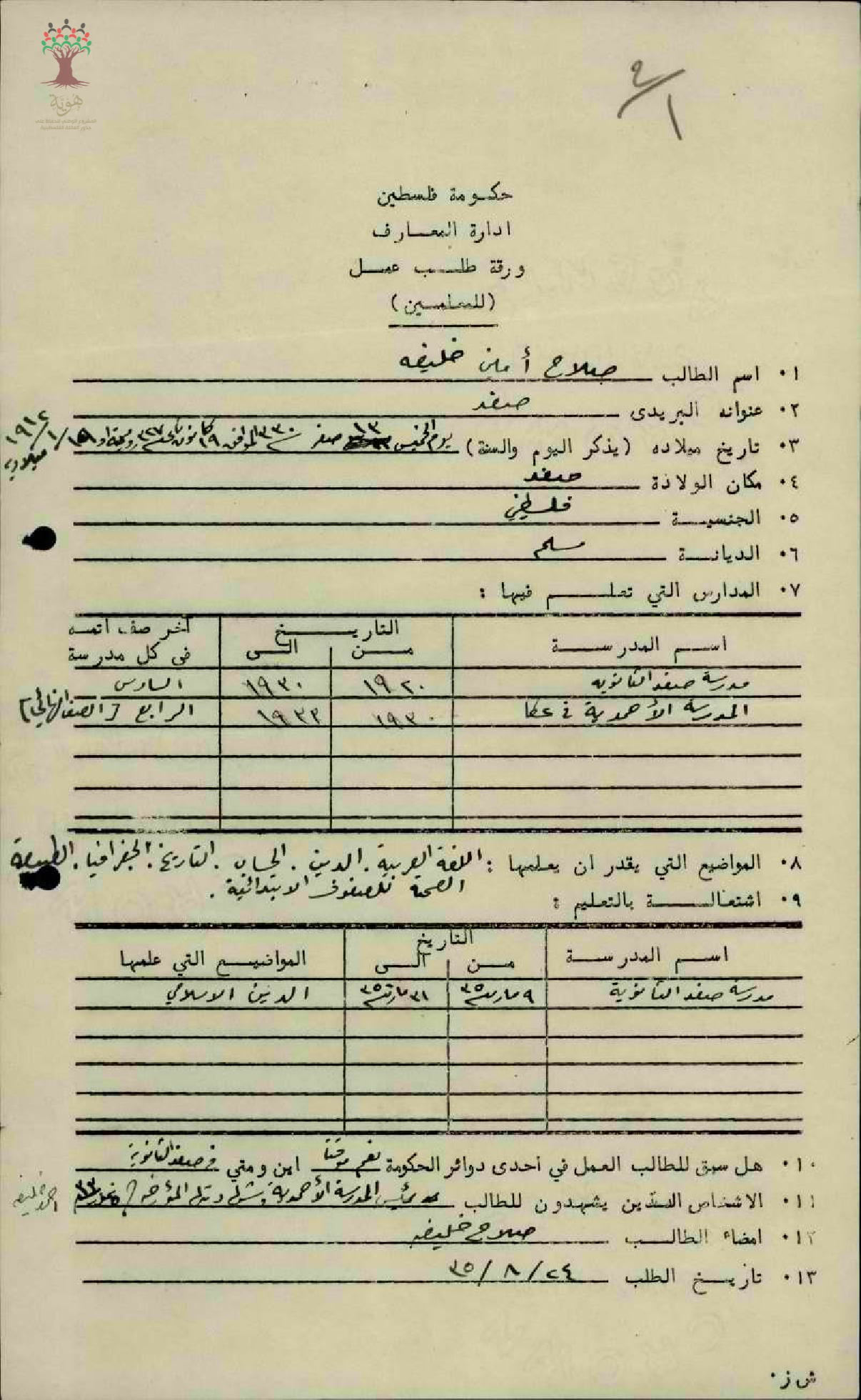 ورقة طلب عمل للمعلم صلاح أمين خليفة/صفد