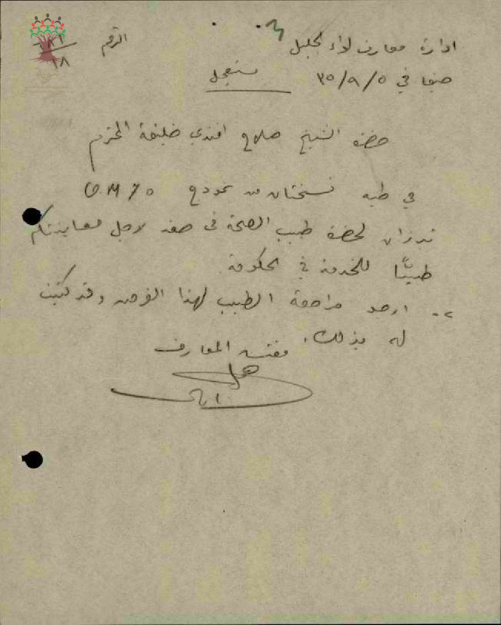 رسالة من مفتش المعارف الى المعلم صلاح خليفة للخضوع للمعاينة الصحية للتعيين