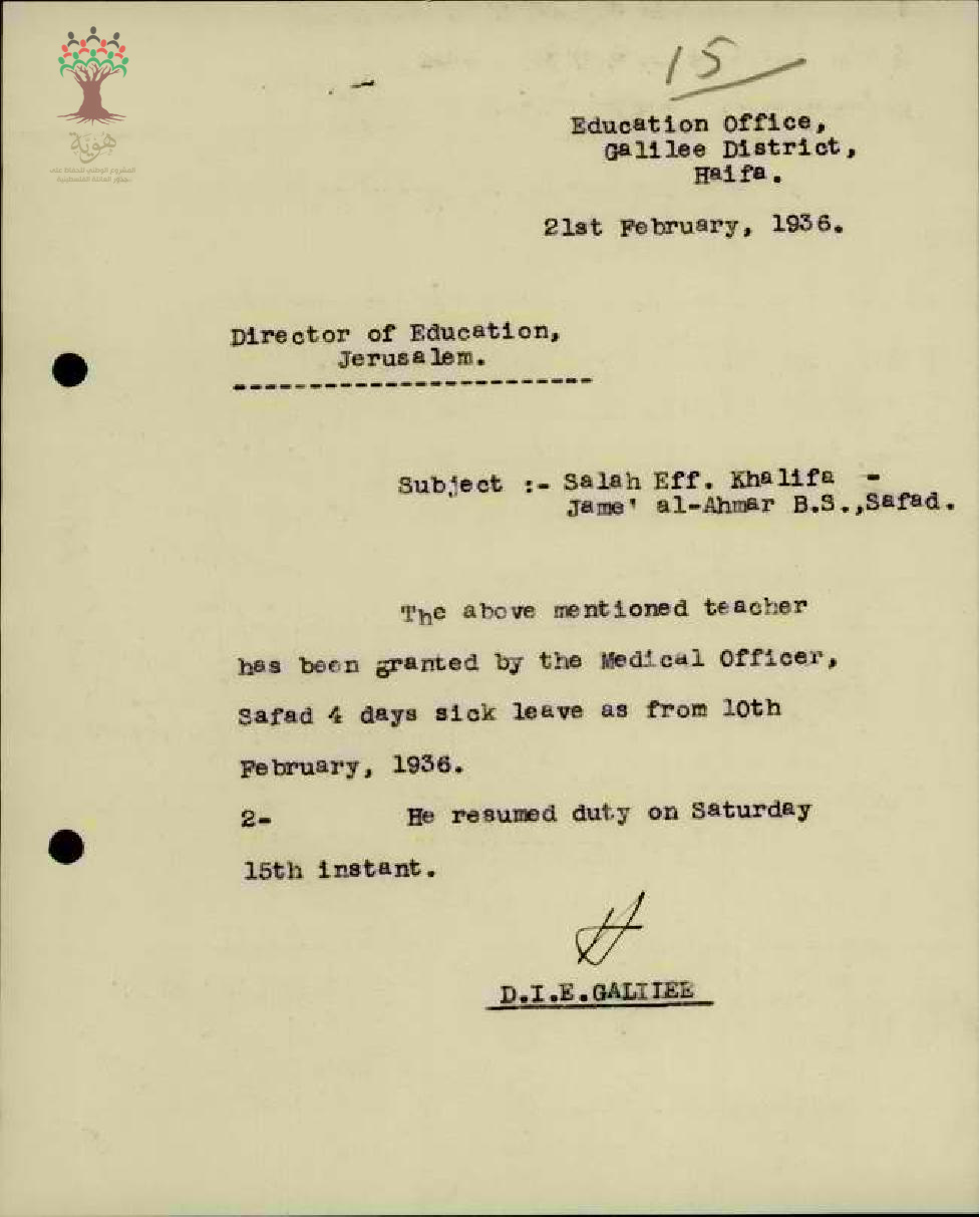 رسالة من مفتش المعارف الى مدير المعارف بخصوص اجازة مرضية للمعلم صلاح خليفة وعودته للعمل