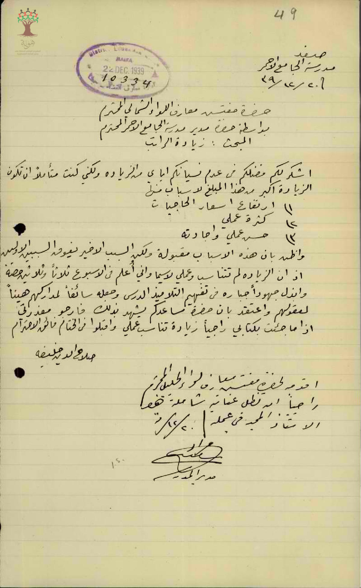 رسالة من المعلم صلاح خليفة الى مفتش المعارف يطلب فيها زيادة راتبه