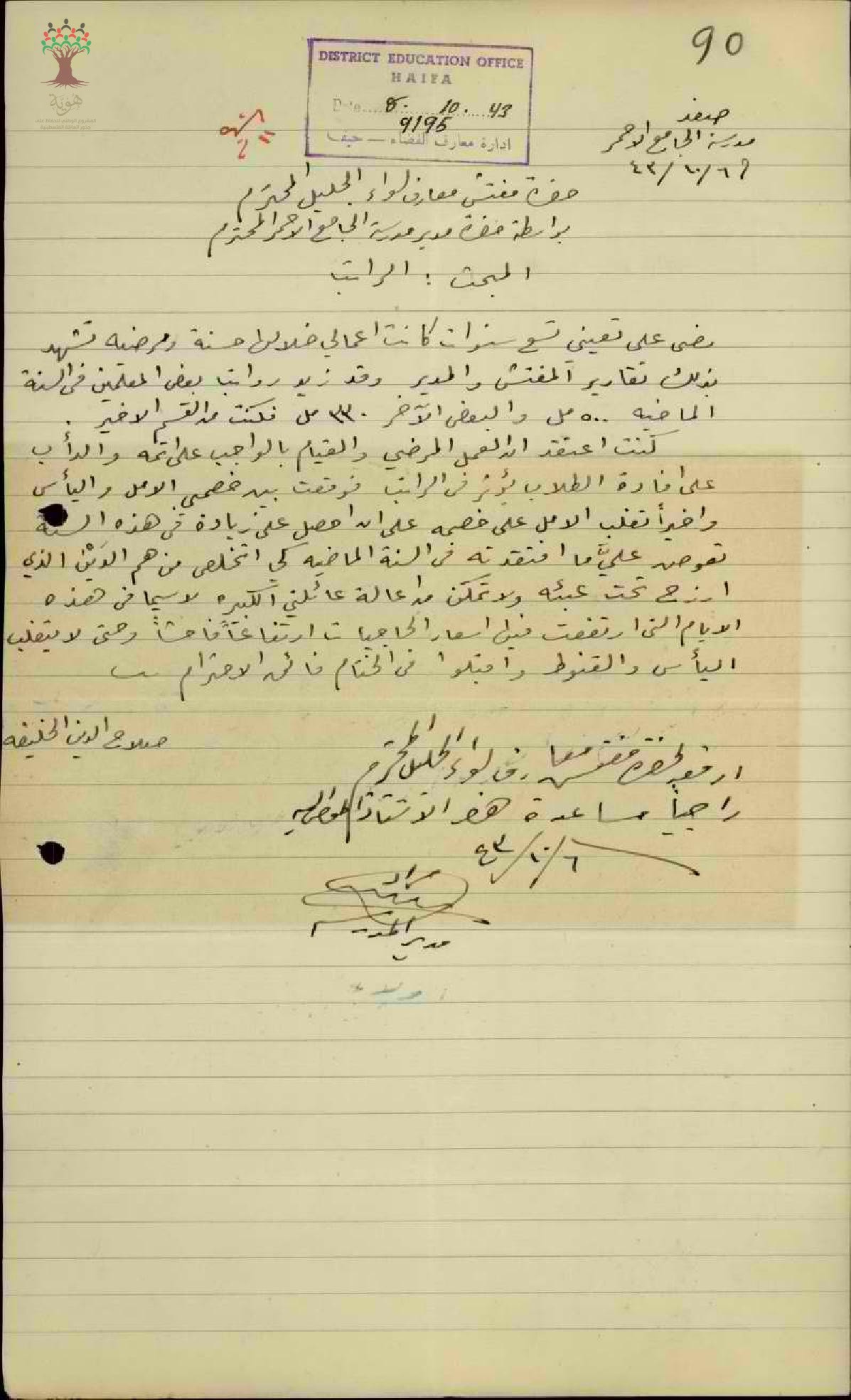 رسالة من المعلم صلاح خليفة الى مفتش المعارف يطلب فيها زيادة راتبه