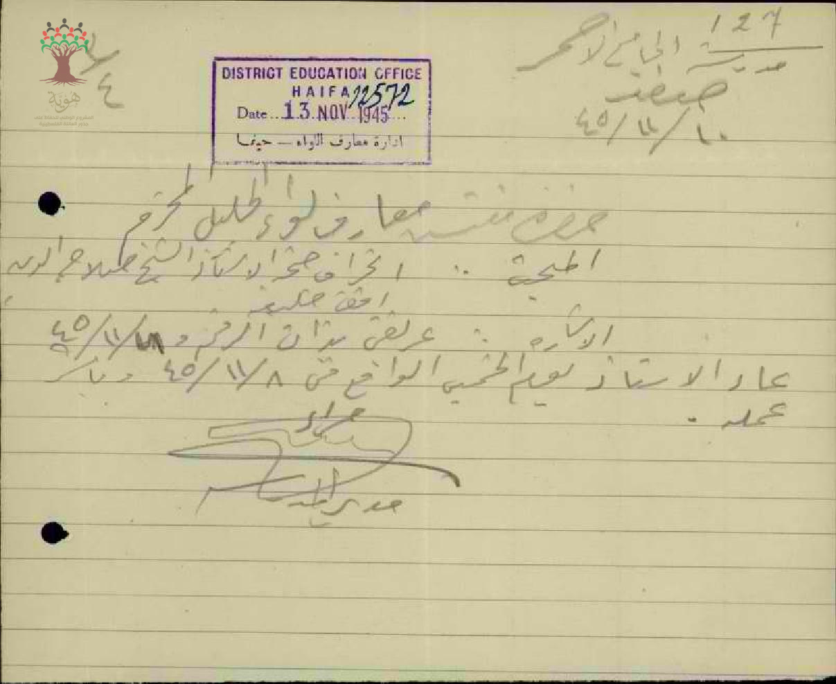 رسالة من مدير مدرسة الجامع الأحمر الى مفتش المعارف بخصوص عودة المعلم صلاح خليفة الى العمل