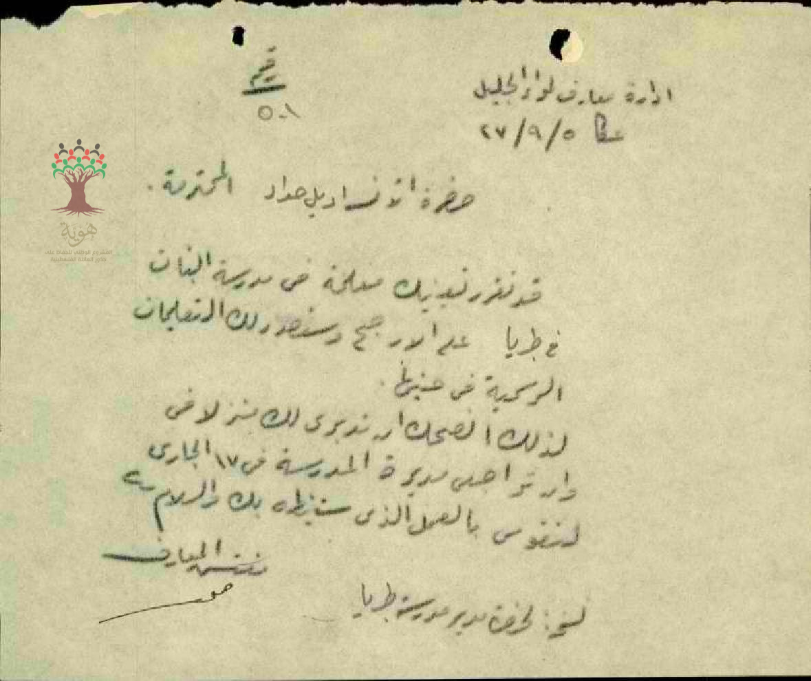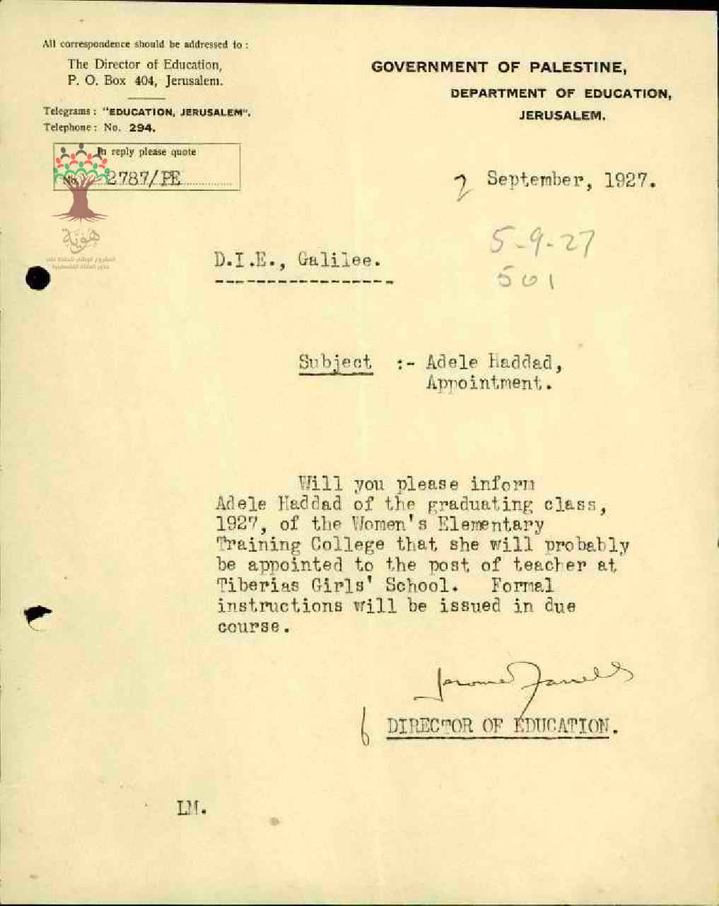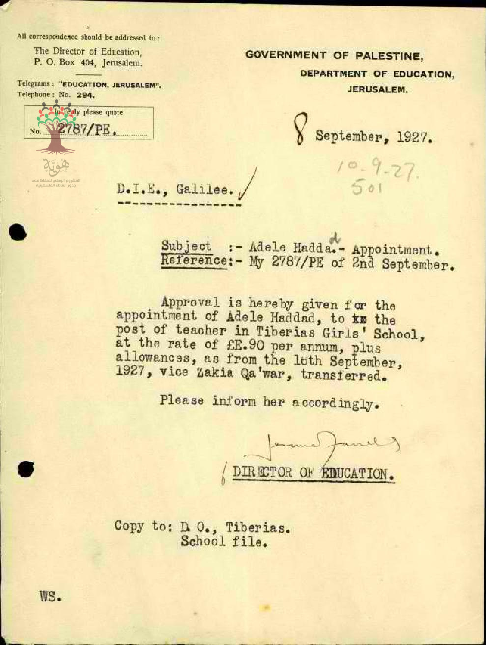 رسائل بخصوص تعيين المعلمة أديل نصر الله حداد في مدرسة البنات في طبريا