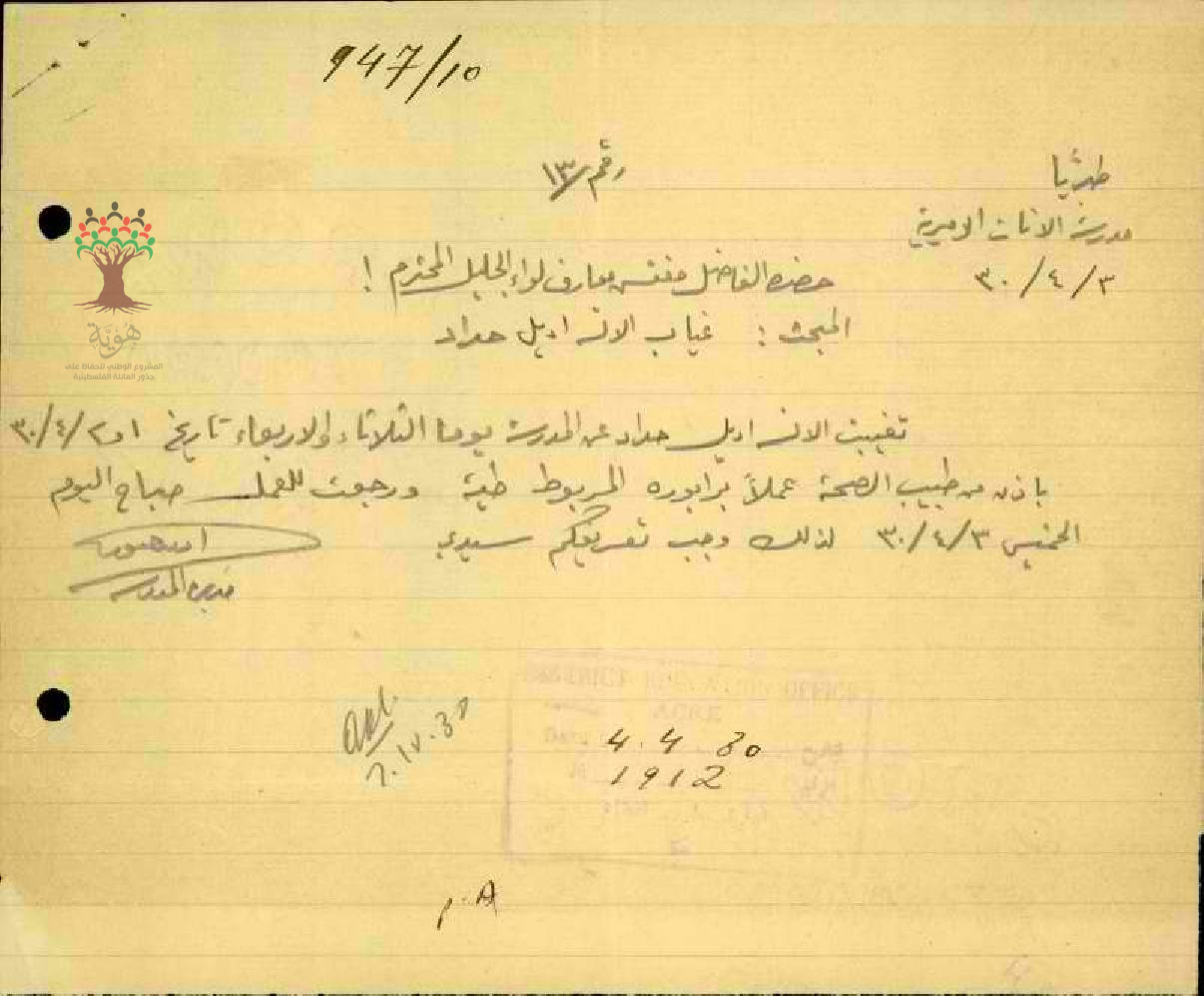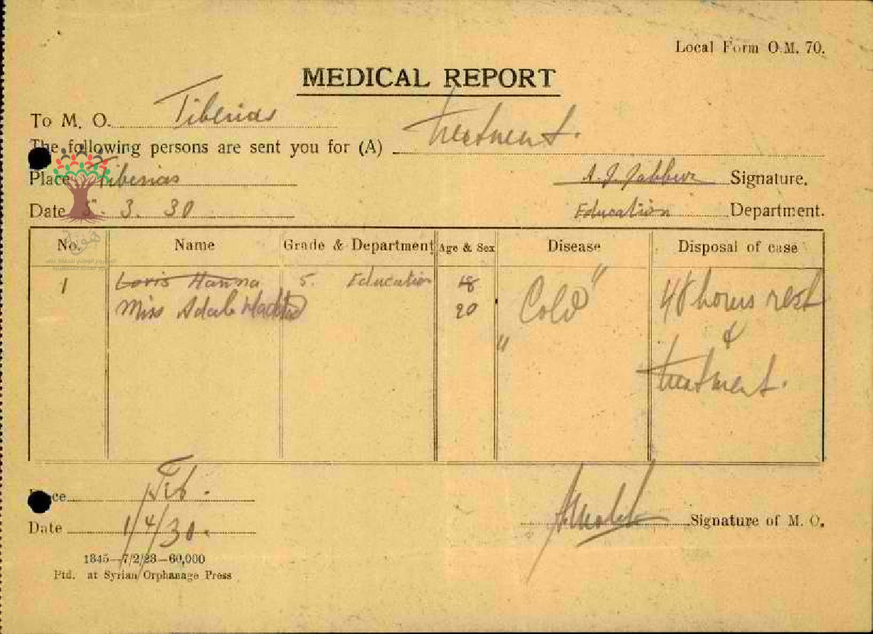 رسالة من مديرة مدرسة طبريا الى مفتش المعارف بخصوص تغيب المعلمة أديل حداد مرفقة بالتقرير الطبي