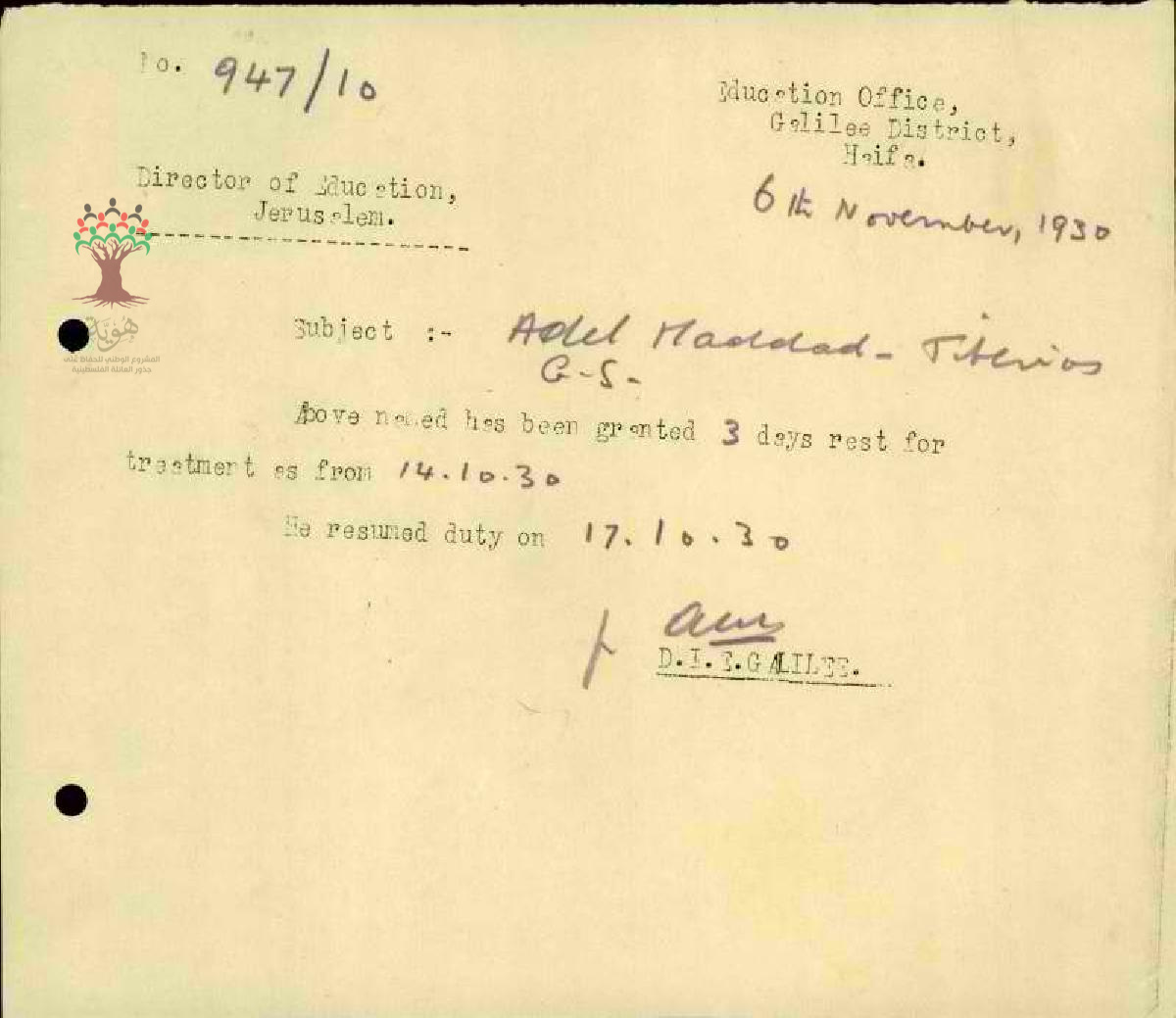 رسالة من مفتش المعارف الى مدير المعارف بخصوص اجازة مرضية للمعلمة أديل حداد