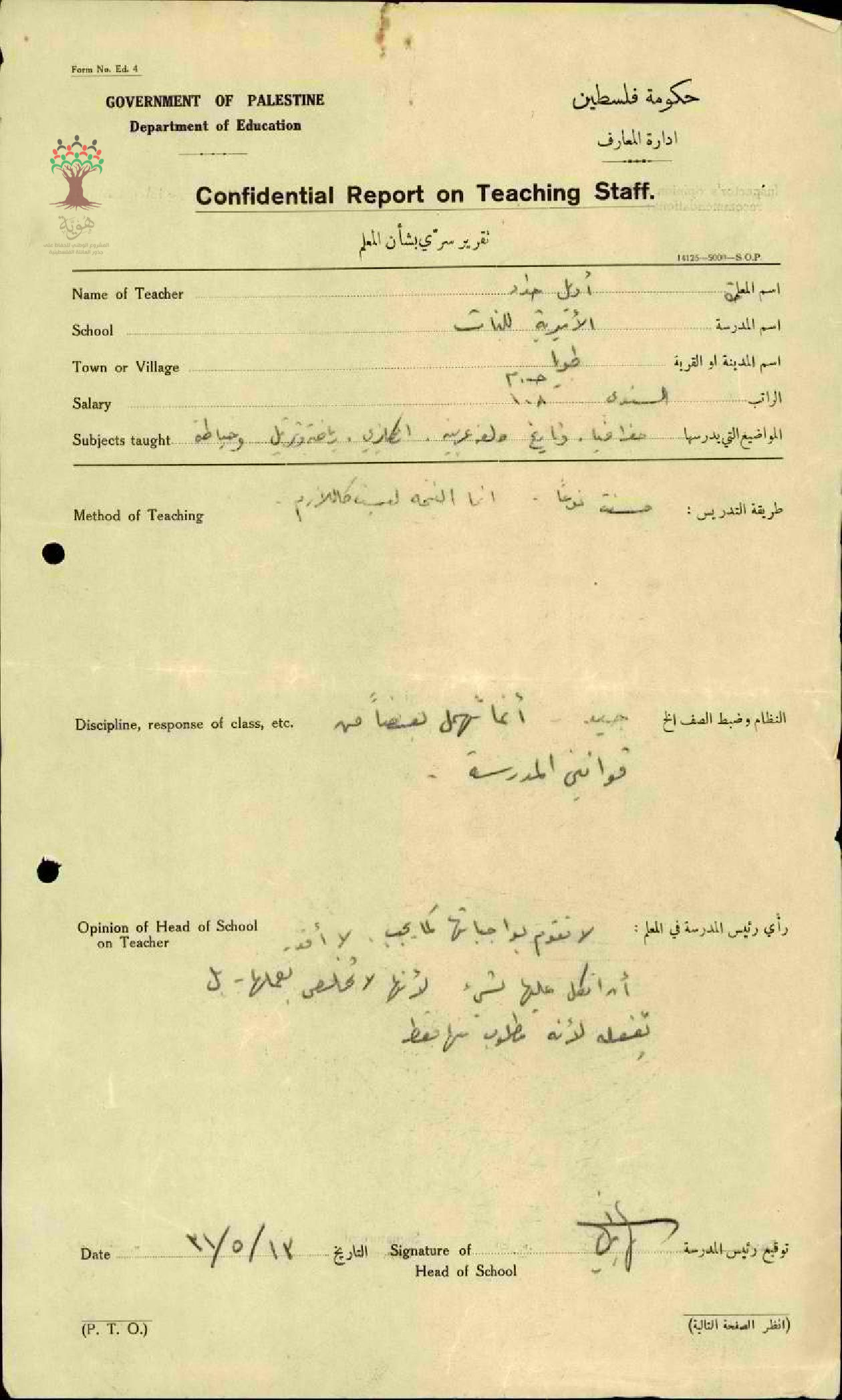 تقرير تفصيلي عن أداء المعلمة أديل نصرالله حداد في مدرسة طبريا للإناث سنة 1931