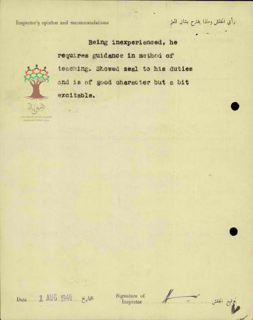 رأي المفتش العام بالمعلم نديم النحوي - صفد - مدرسة عكا