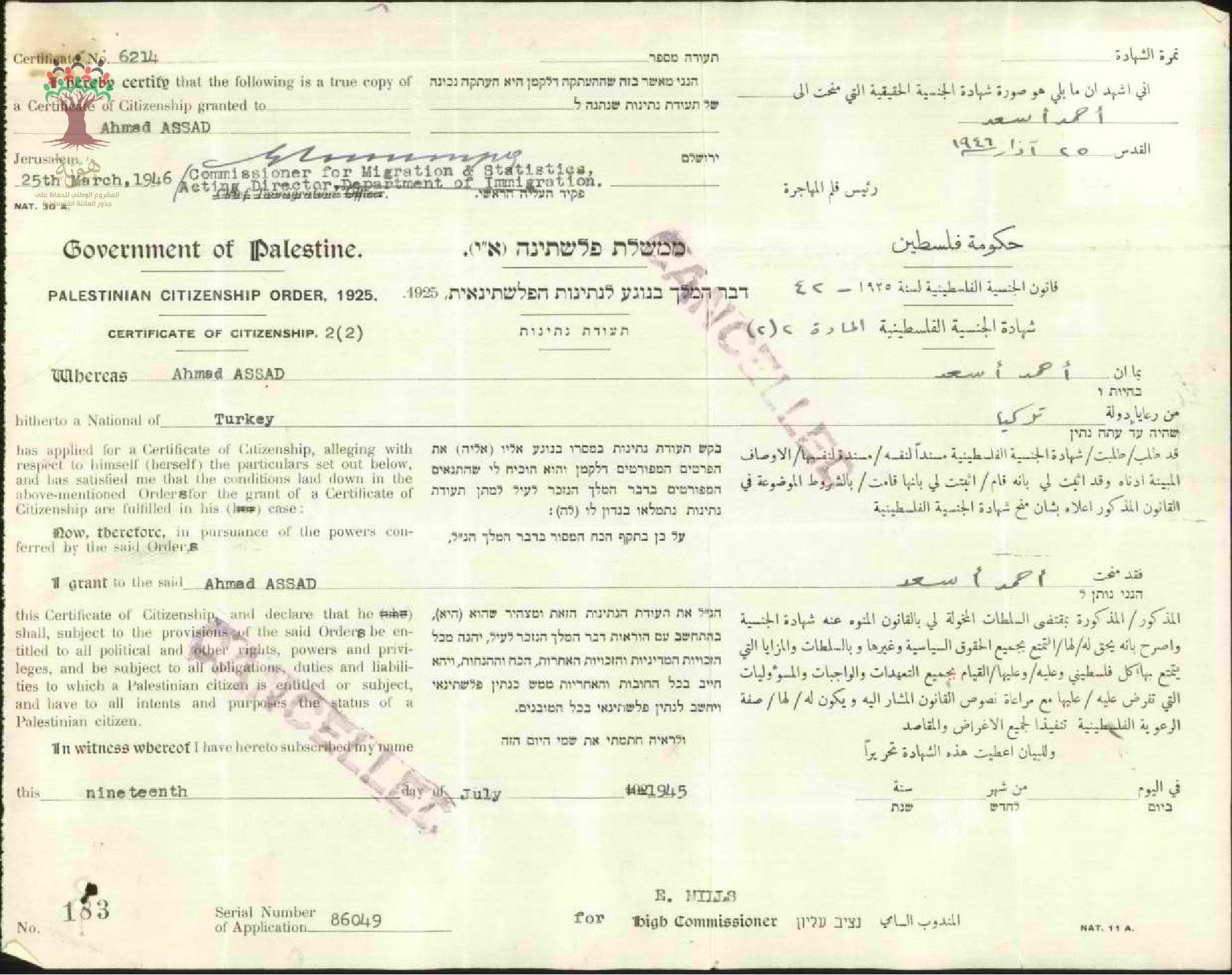 صورة شهادة الجنسية الفلسطينية التي حصل عليها أحمد أسعد (ترشيحا) عام 1945