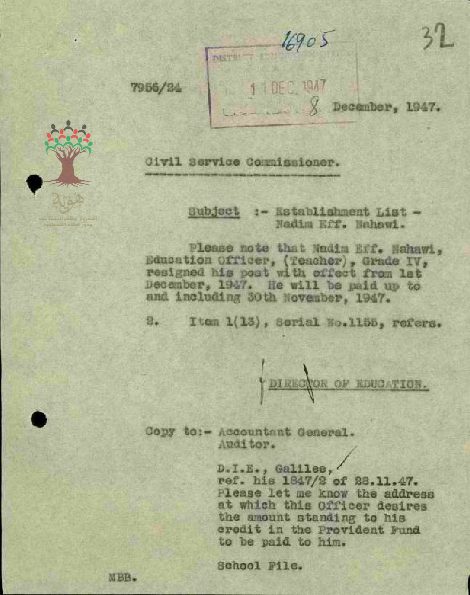 استقالة المعلم نديم النحوي - صفد - مدرسة عكا