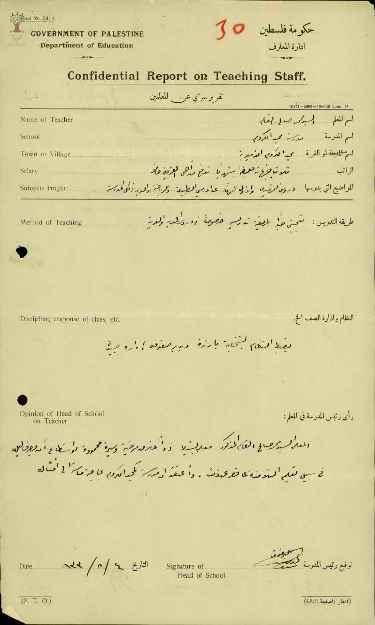 تقرير تفصيلي عن أداء المعلم محمد قاسم في مدرسة الطيرة سنة 1933
