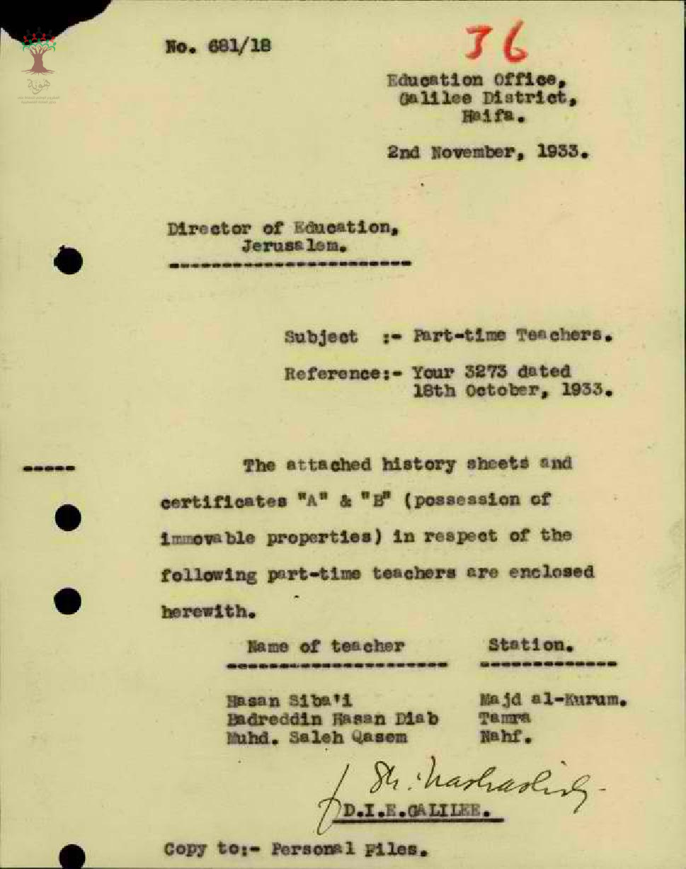 رسالة من مفتش المعارف الى مدير المعارف بخصوص أوراق تعيين المعلم محمد قاسم