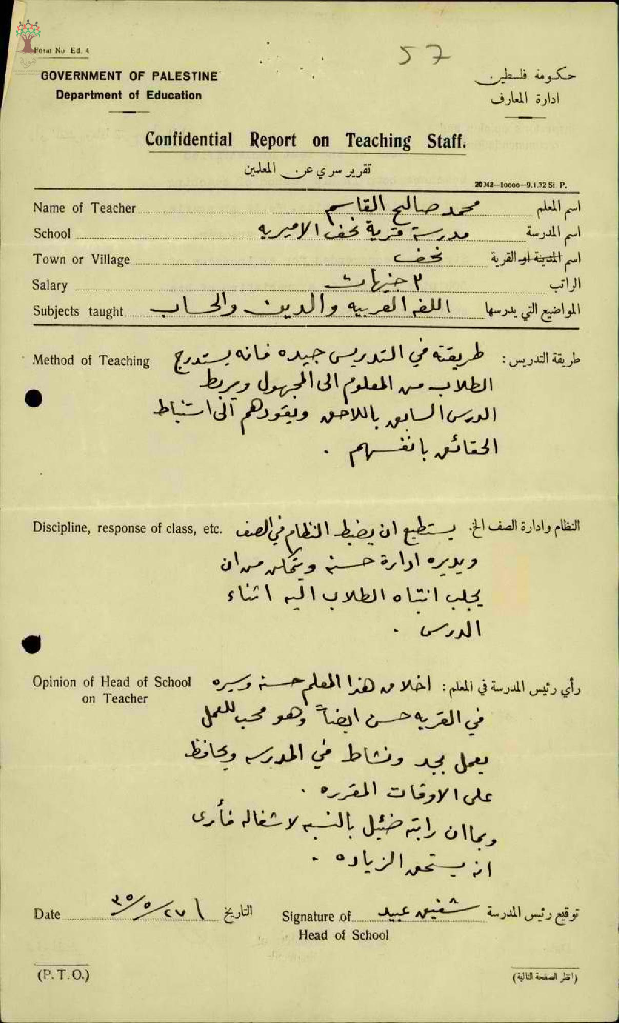 تقرير تفصيلي عن أداء المعلم محمد قاسم في مدرسة نحف سنة 1935