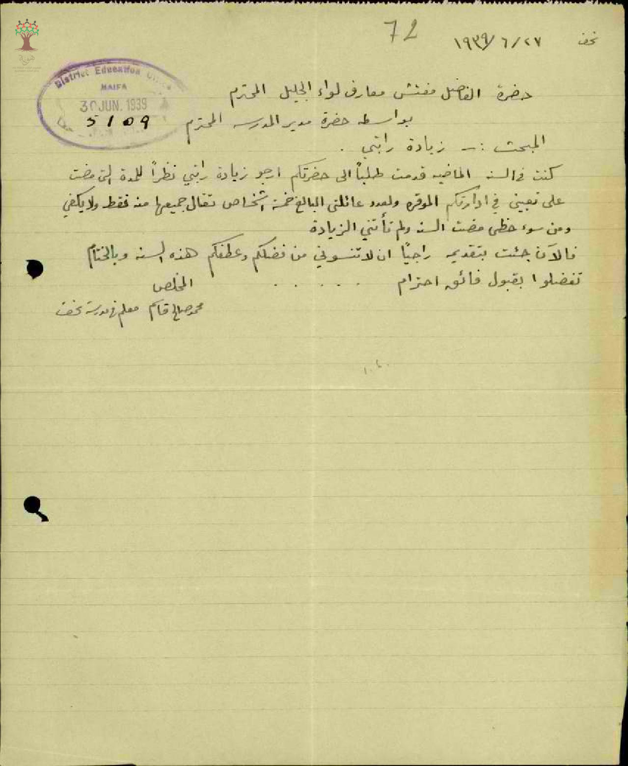 رسالة من المعلم محمد قاسم الى مفتش المعارف يطلب فيها زيادة راتبه