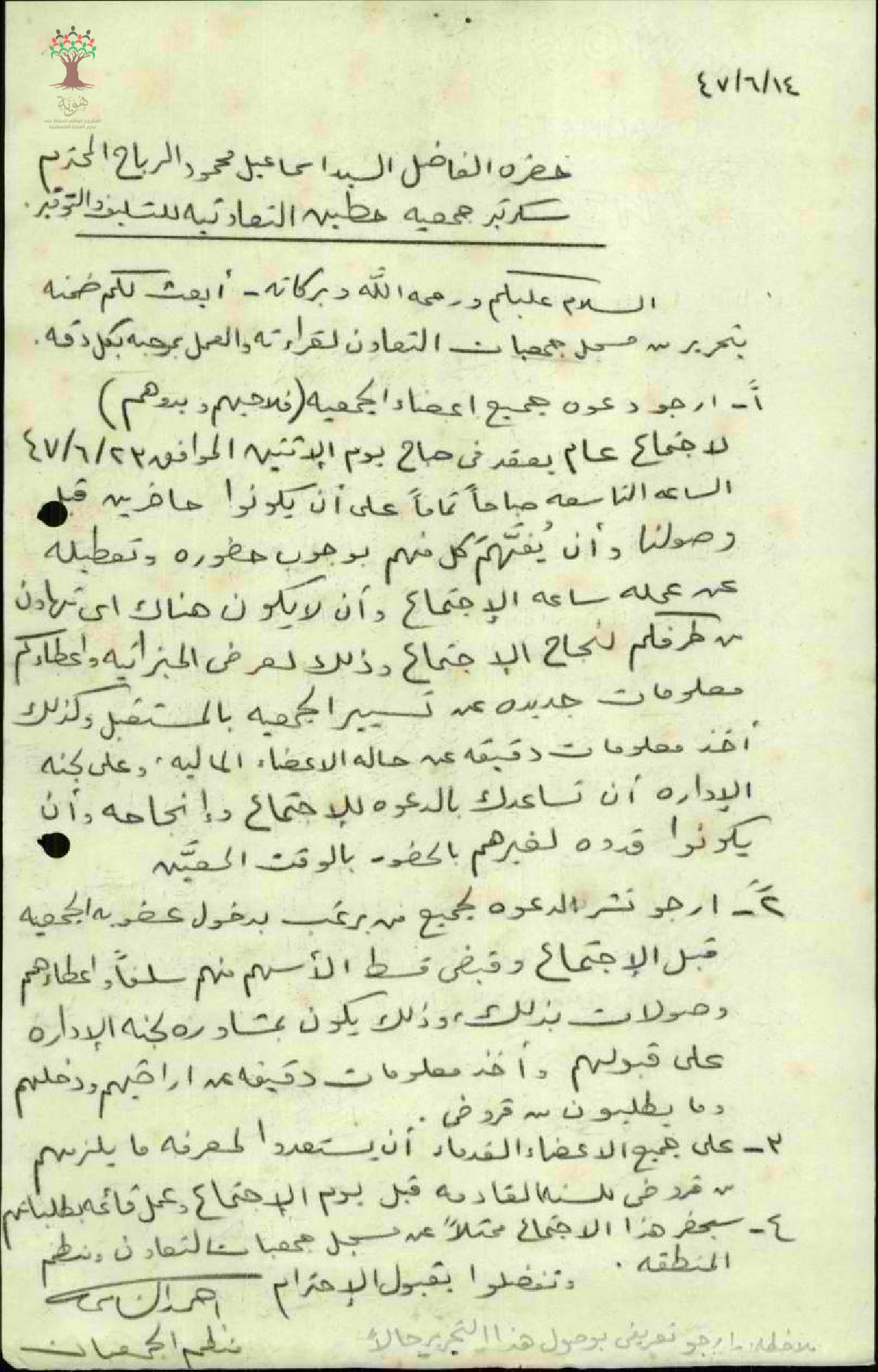 دعوة من منظم الجمعيات في الناصرة لاجتماع عام للجمعية التعاونية في حطين بتاريخ 23/6/1947 يحضره أعضاء الجمعية ومن رغب بالانضمام لإليها