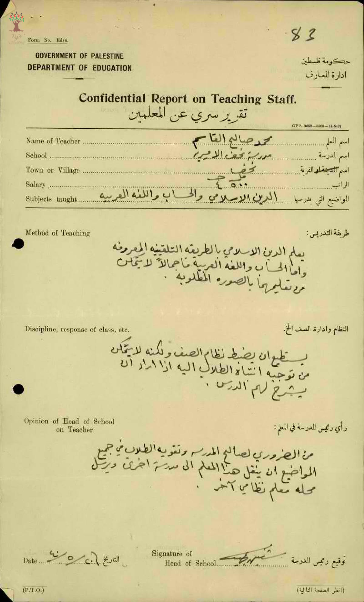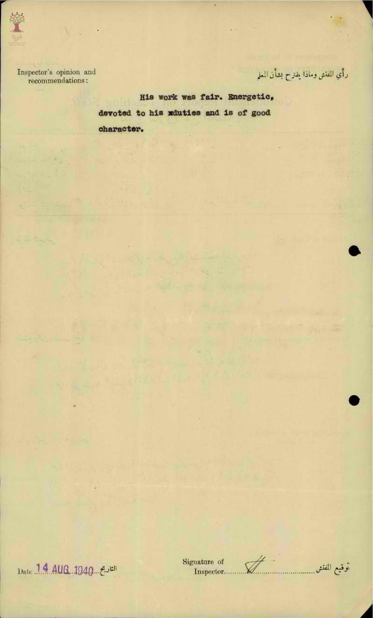 تقرير تفصيلي عن أداء المعلم محمد قاسم في مدرسة نحف سنة 1940