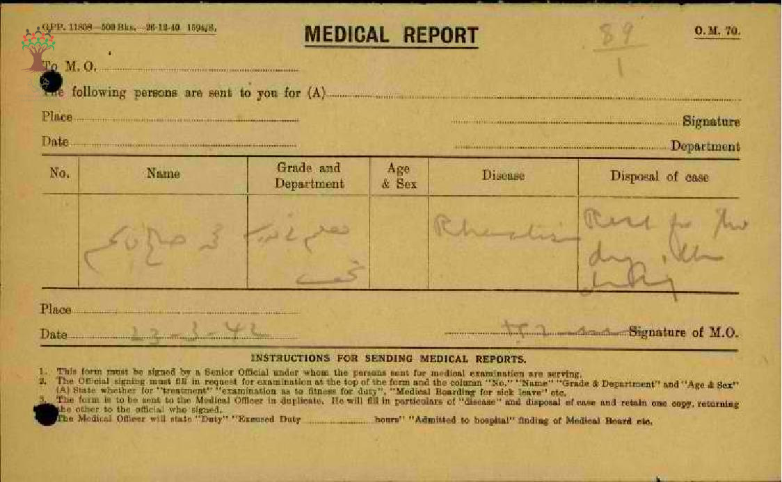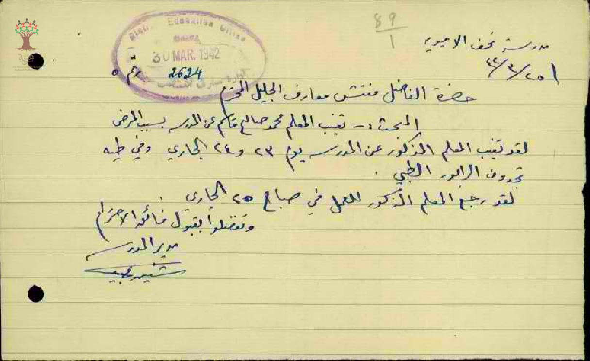 رسالة من مدير مدرسة نحف الى مفتش المعارف بخصوص تغيب المعلم محمد قاسم مرفقة بالتقرير الطبي وعودته الى العمل