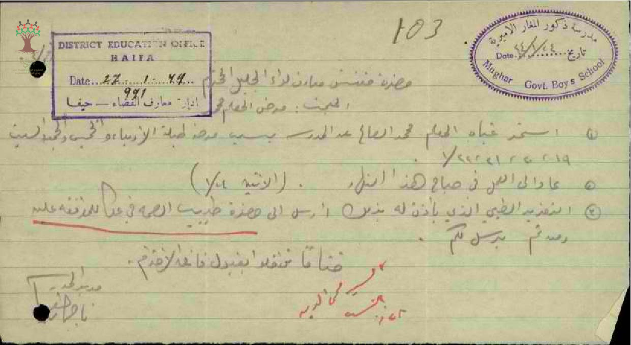 رسالة من مدير مدرسة المغار الى مفتش المعارف بخصوص عودة المعلم محمد قاسم ال العمل