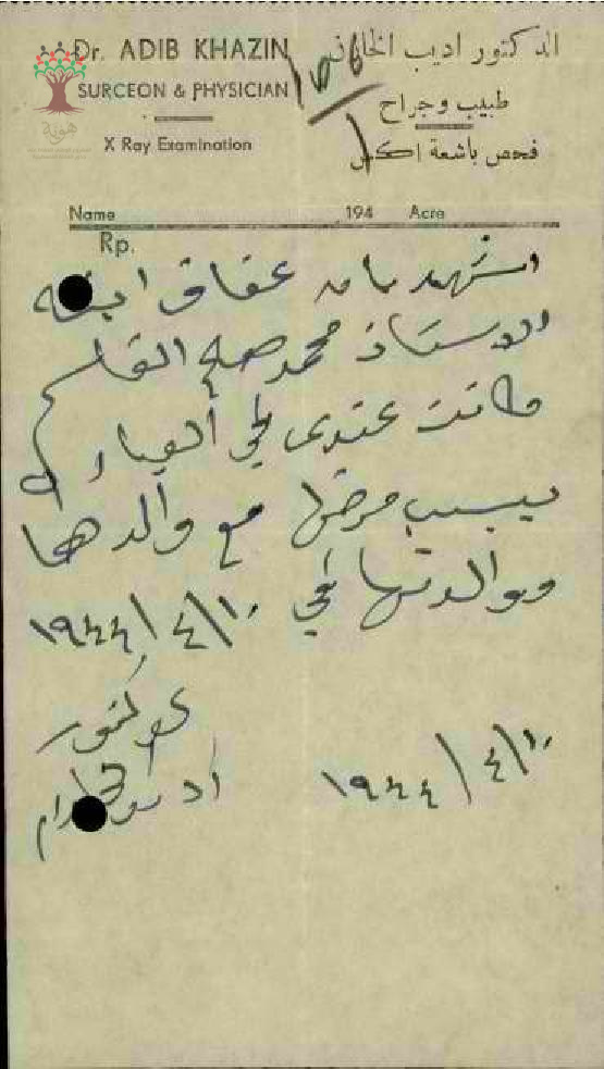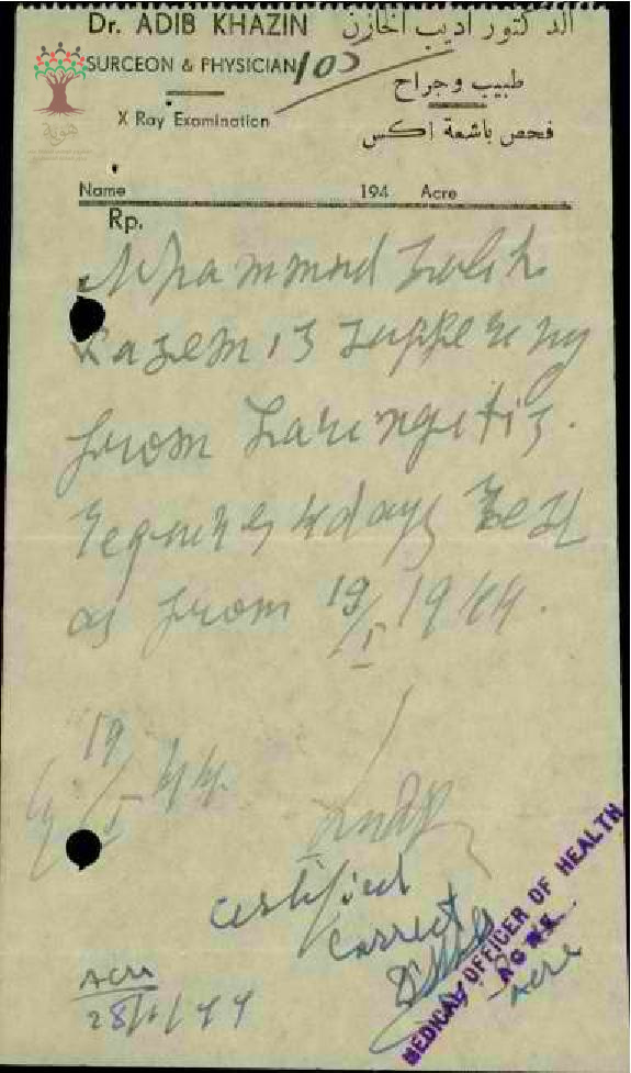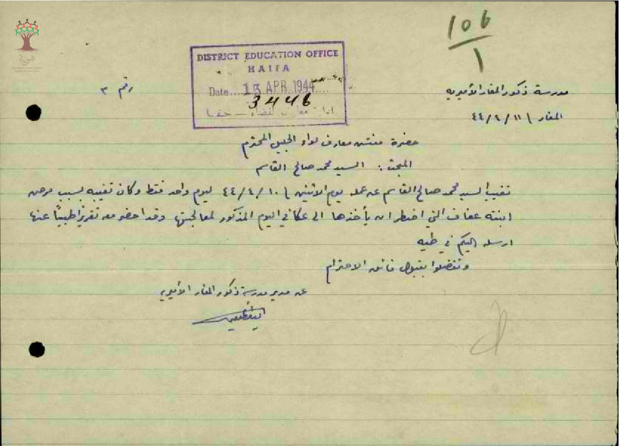 رسالة من مدير مدرسة المغار الى مفتش المعارف بخصوص تغيب المعلم محمد قاسم بسبب مرض ابنته مرفقة بالتقارير الطبية