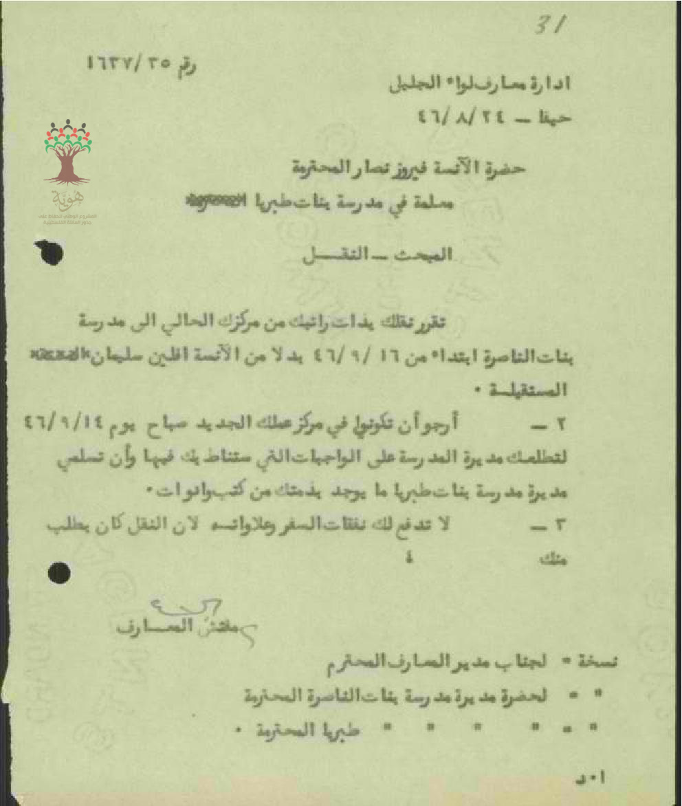 نقل المعلمة فيروز نصار من مدرسة اناث طبريا الى مدرسة الناصرة للاناث