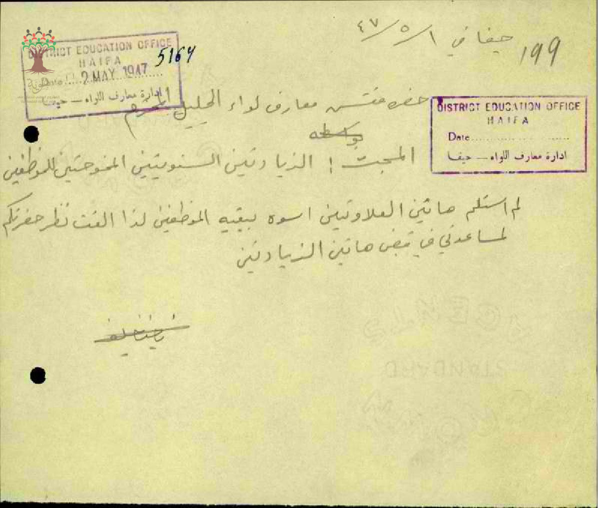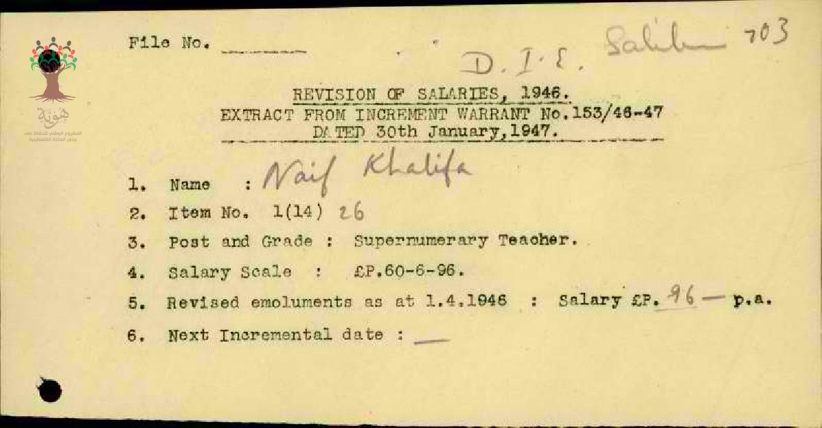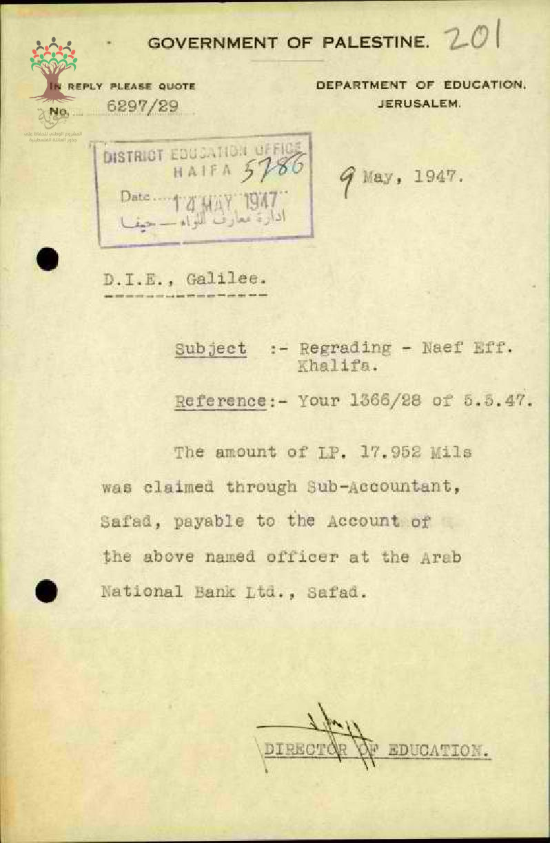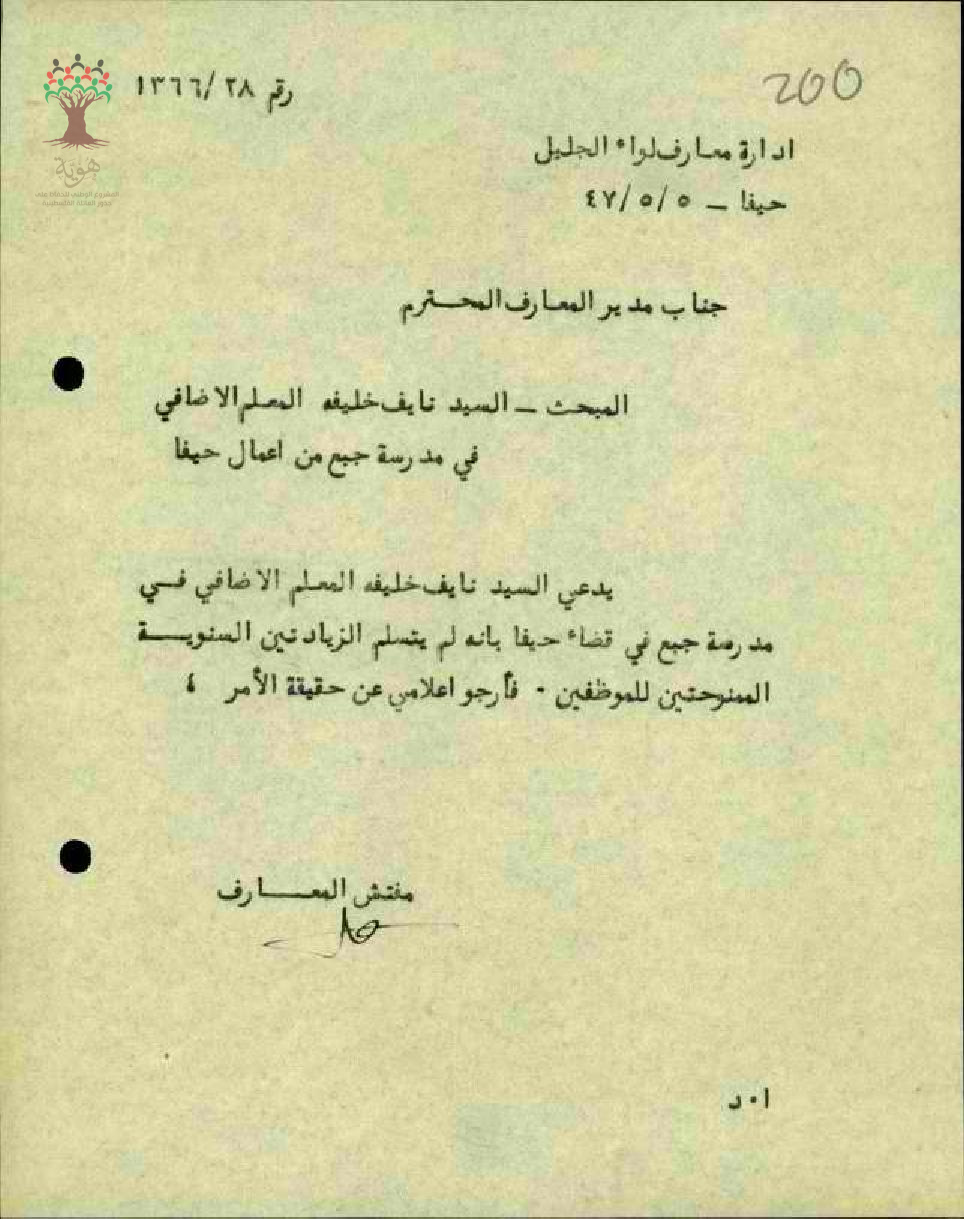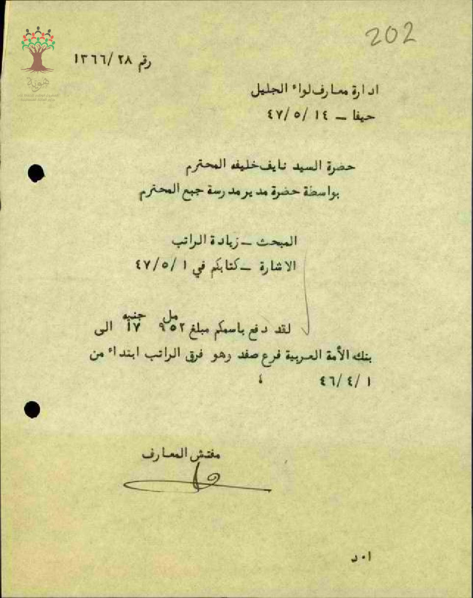 مراسلات بخصوص علاوة سنوية المعلم نايف خليفة - صفد - مدرسة جبع