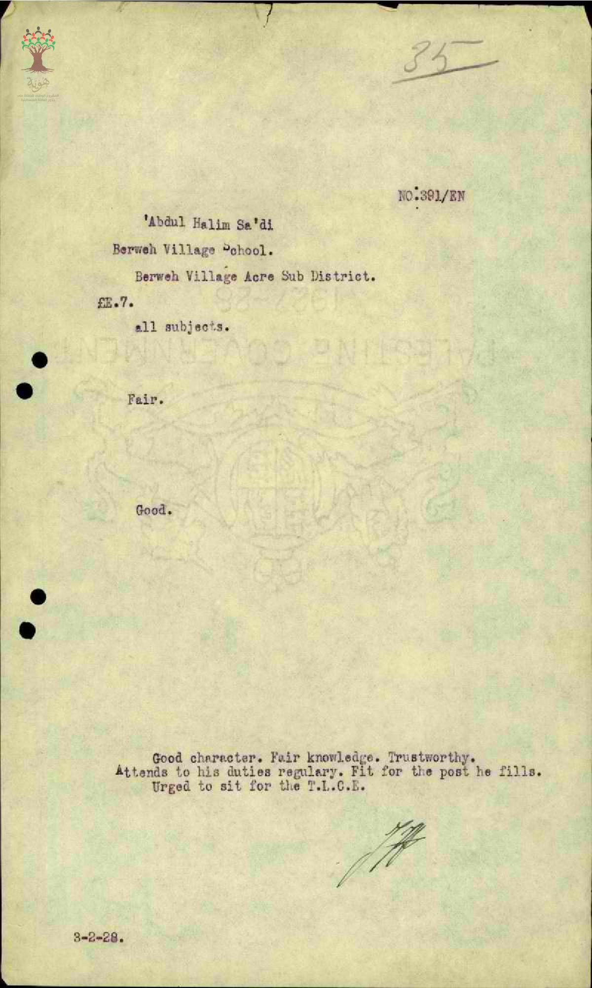 تقرير عن أداء المعلم عبد الحليم السعدي في مدرسة البروة سنة 1928