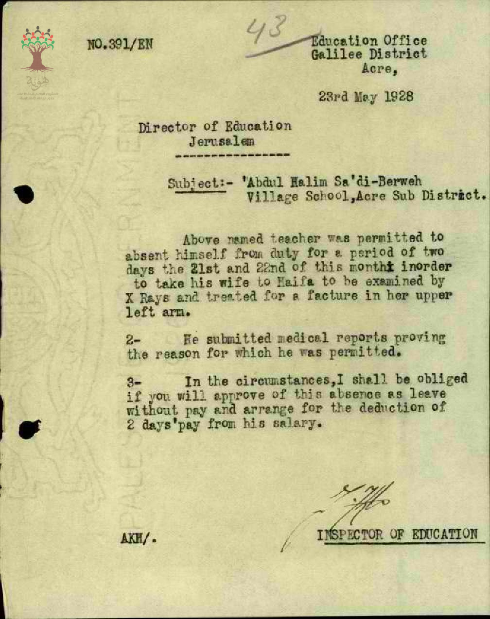 رسالة من مفتش المعارف الى مدير المعارف بخصوص تغيب المعلم عبد الحليم السعدي