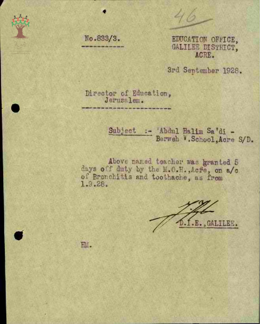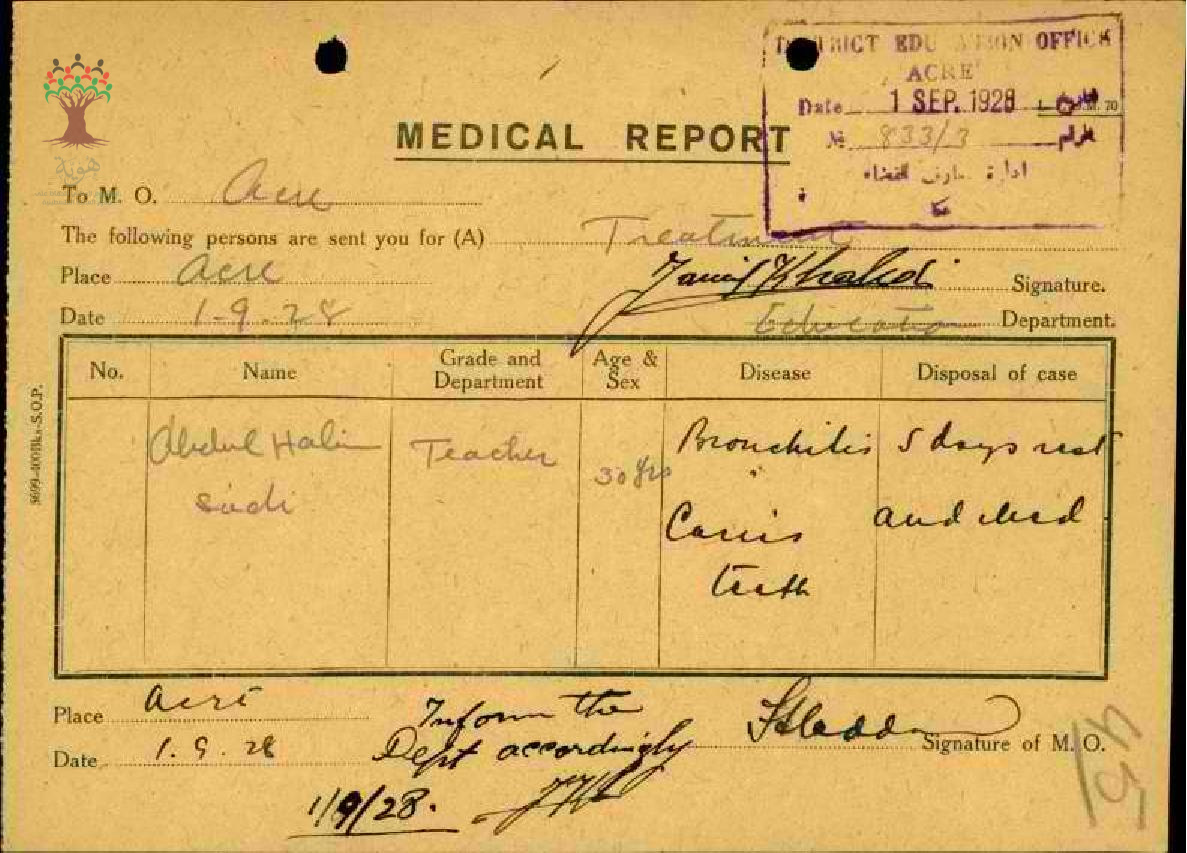 رسالة من مفتش المعارف الى مدير المعارف بخصوص اجازة مرضية للمعلم عبد الحليم السعدي مرفقة بالتقرير الطبي