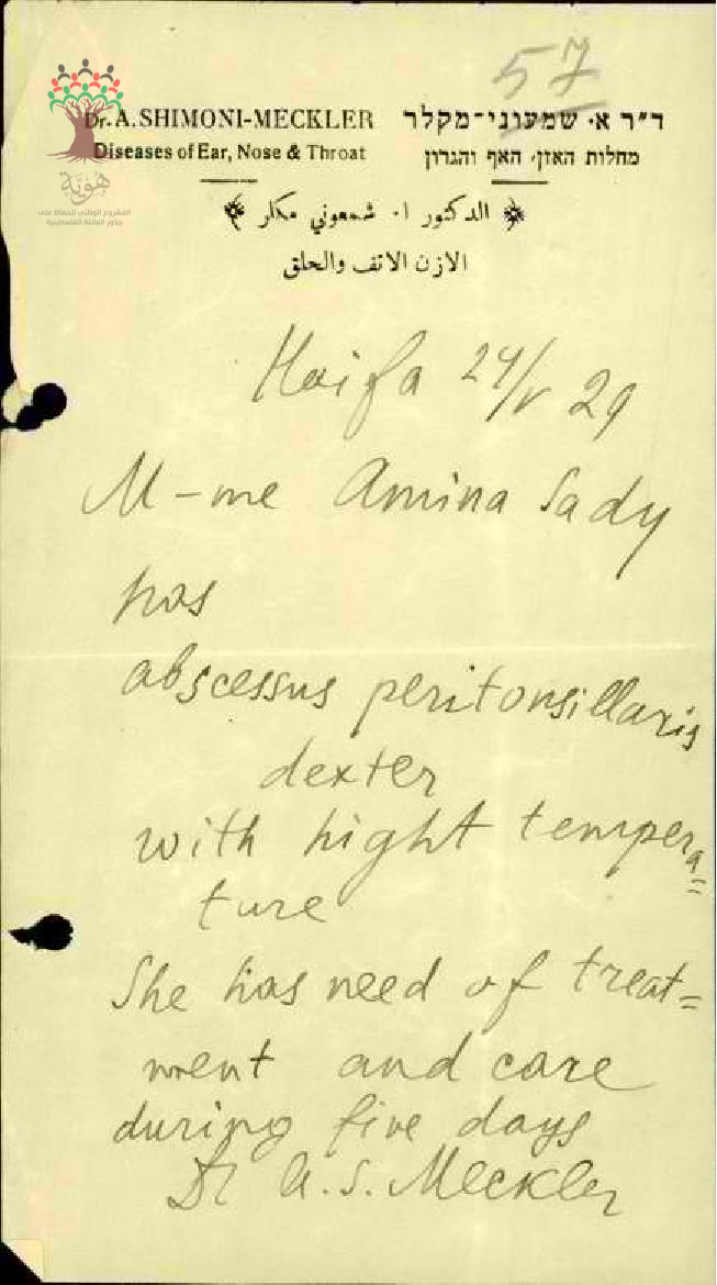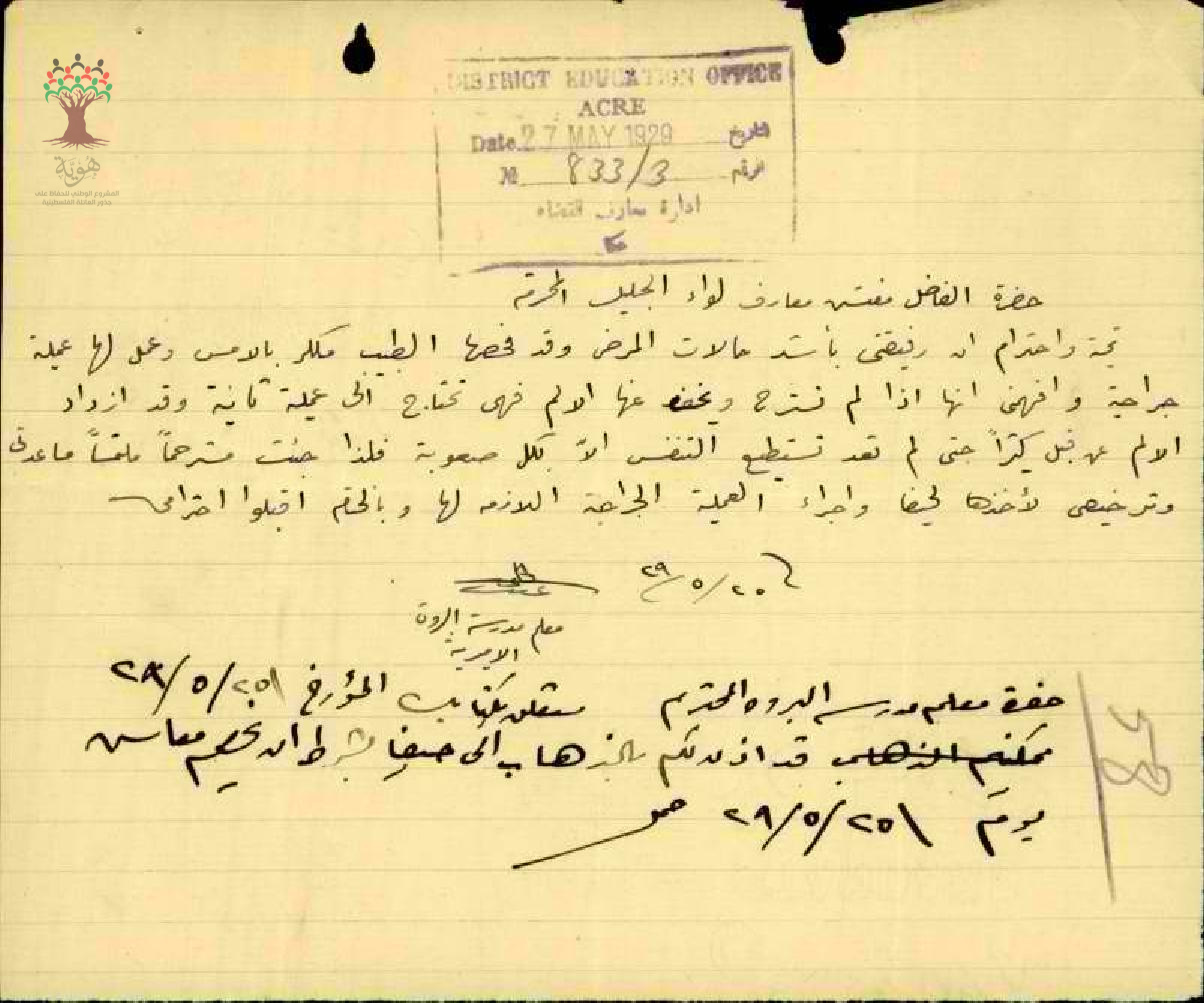 رسالة من المعلم عبد الحليم السعدي الى مفتش المعارف يطلب التغيب عن المدرسة بسبب مرض زوجته مرفقة بالتقرير الطبي