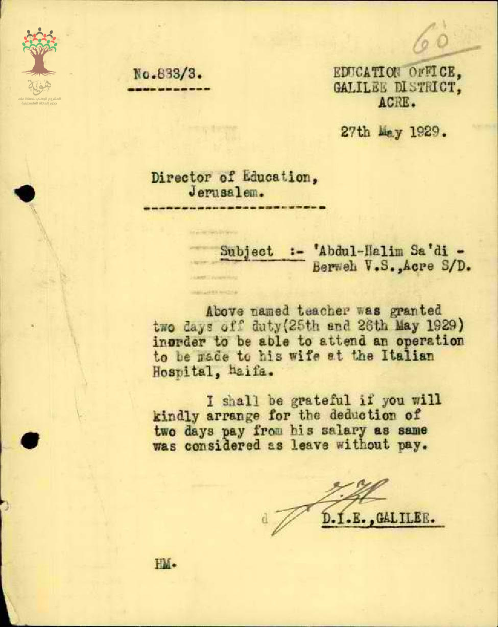 رسالة من مفتش المعارف الى مدير المعارف بخصوص تغيب المعلم عبد الحليم السعدي بسبب مرض زوجته