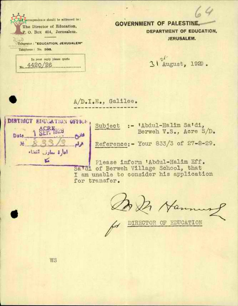 رسالة من مدير المعارف الى مفتش المعارف يخبره بأنه لا يمكن نقل المعلم عبد الحليم السعدي حالياً