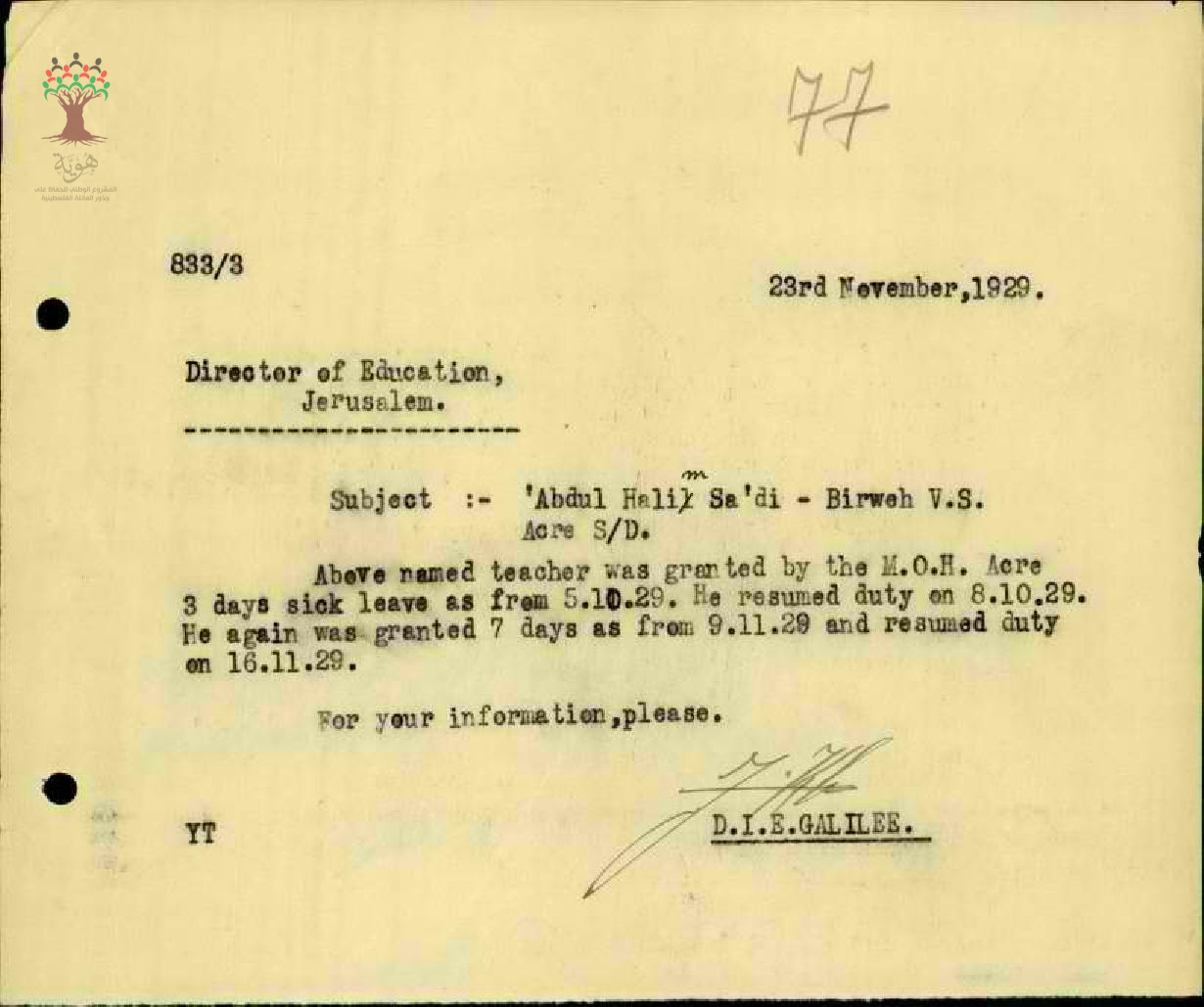 رسالة من مفتش المعارف الى مدير المعارف بخصوص اجازة مرضية للمعلم عبد الحليم السعدي وعودته للعمل