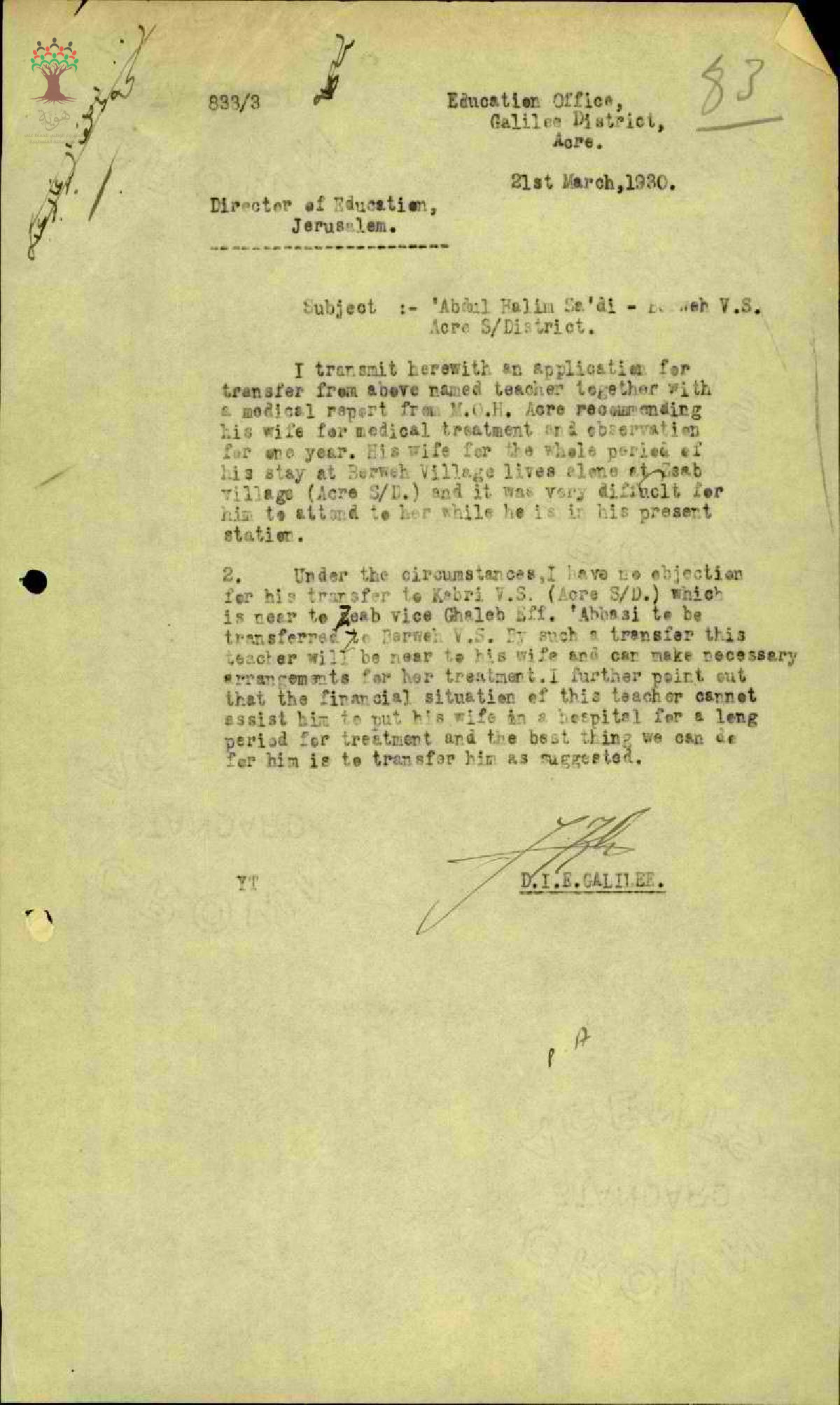 رسالة من مفتش المعارف الى مدير المعارف بخصوص طلب المعلم عبد الحليم السعدي نقله من البروة الى الكابري بسبب مرض زوجته