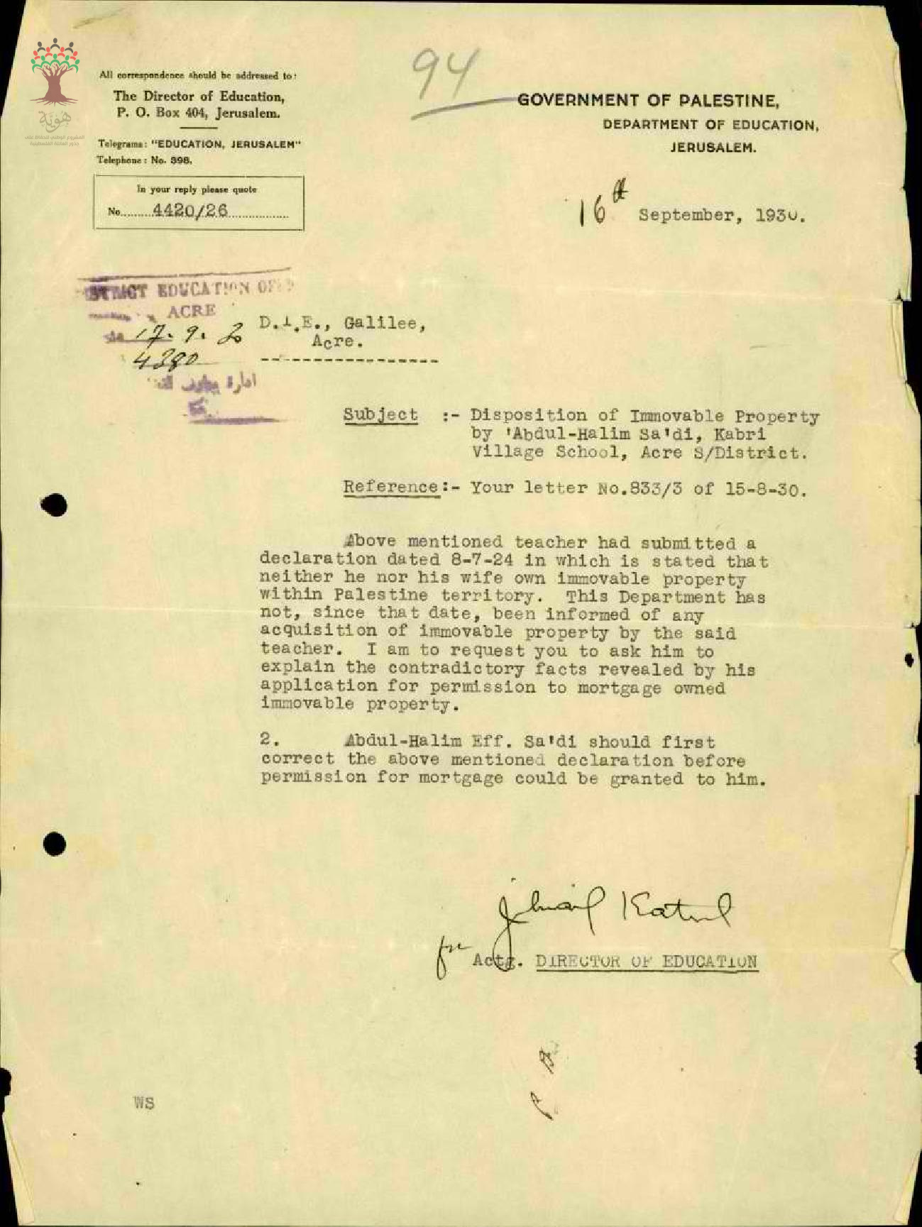 مجموعة رسائل بخصوص الأملاك الغير منقولة للمعلم عبد الحليم السعدي ورهن جزء منها