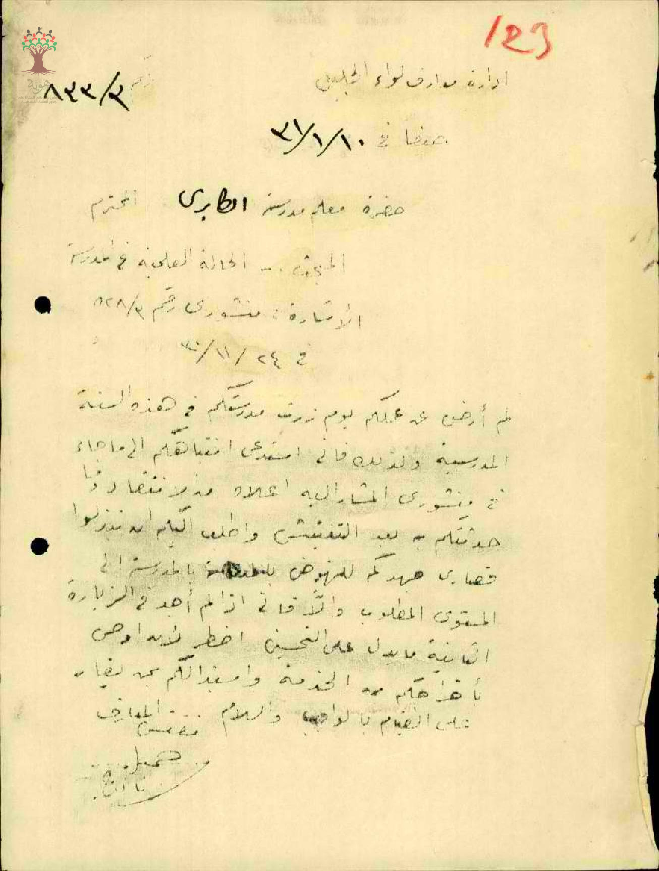 رسالة من مفتش المعارف الى المعلم عبد الحليم السعدي بخصوص الحالة العلمية في المدرسة