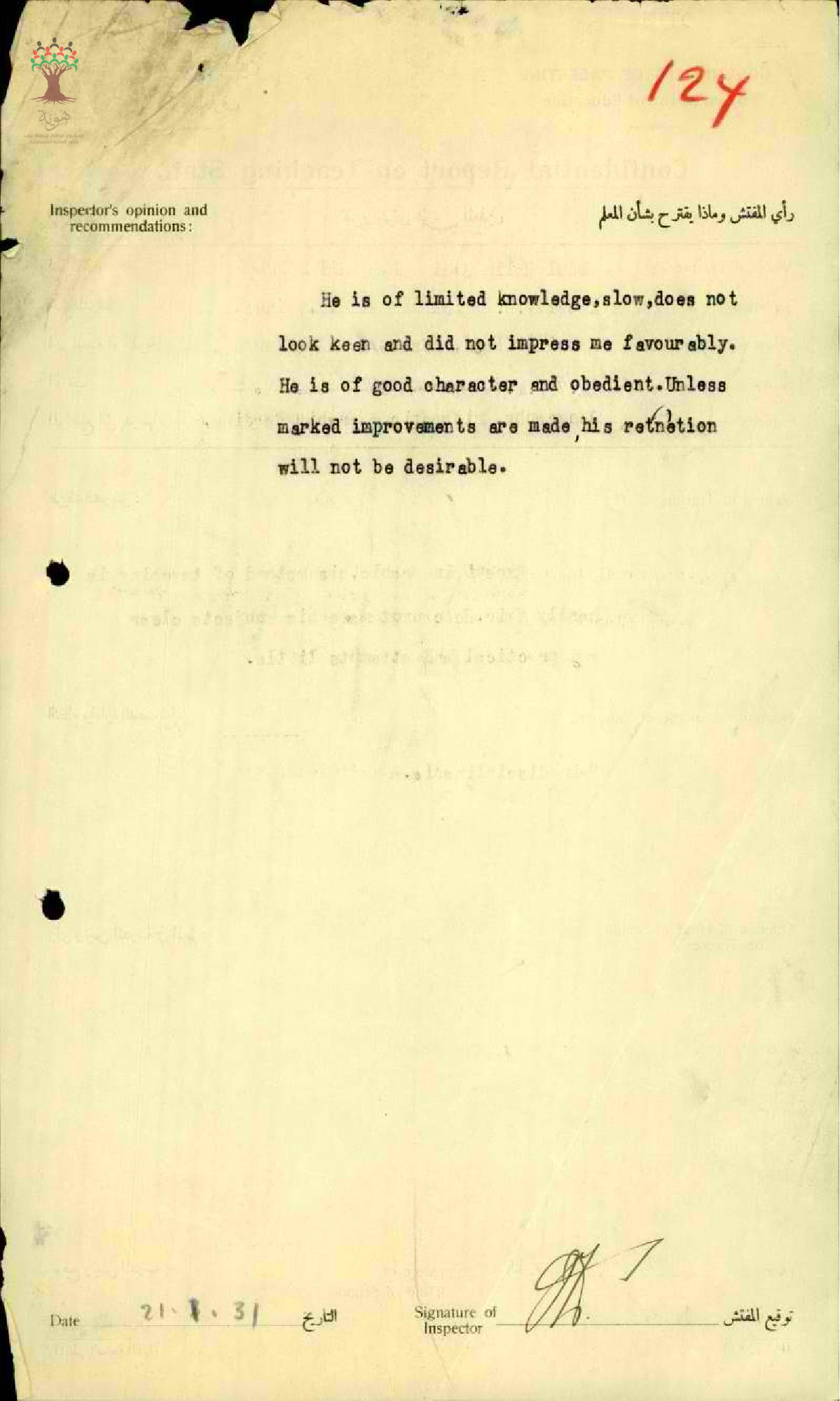 تقرير تفصيلي عن أداء المعلم عبد الحليم السعدي في مدرسة الكابري سنة 1930