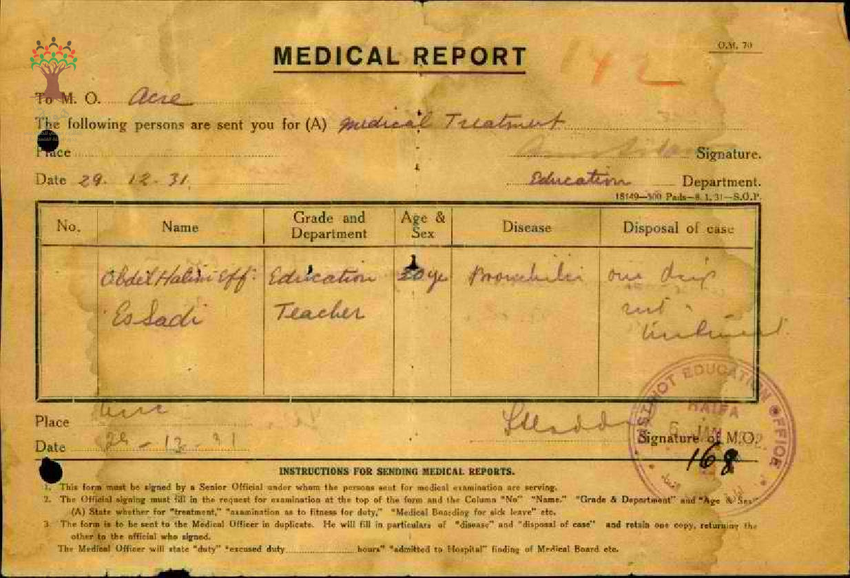 تقرير طبي عن غياب المعلم عبد الحليم السعدي-مدرسة الكابري