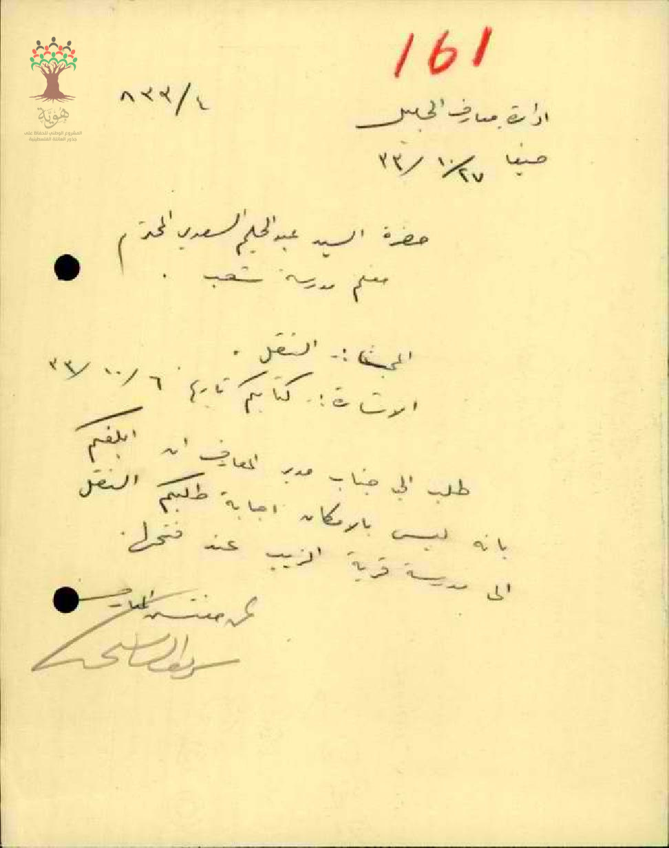 رسائل بخصوص عدم امكانية نقل المعلم عبد الحليم السعدي الى الزيب