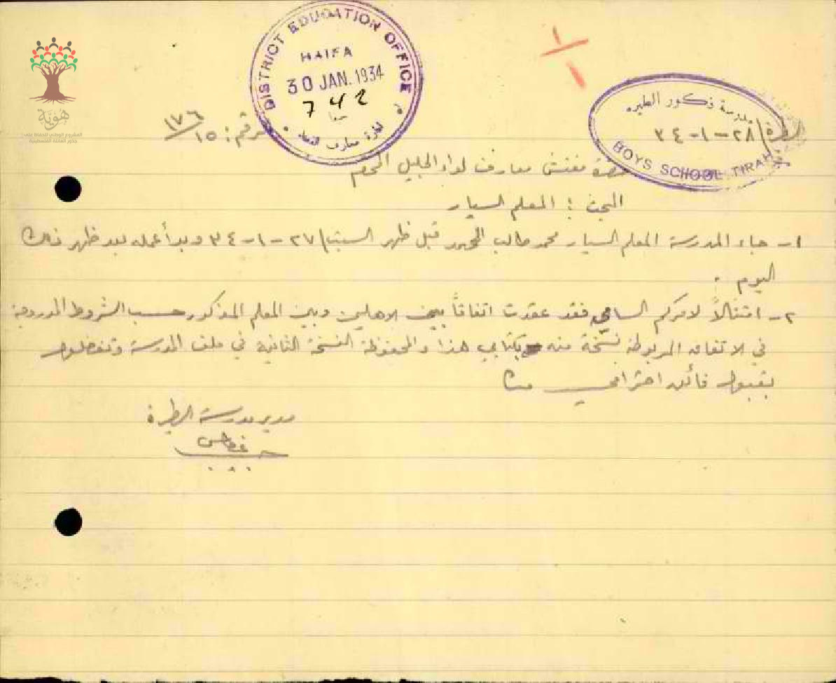 رسالة من مدير مدرسة الطيرة الى مفتش المعارف يخبره بأن المعلم محمد طالب حمد قد باشر عمله