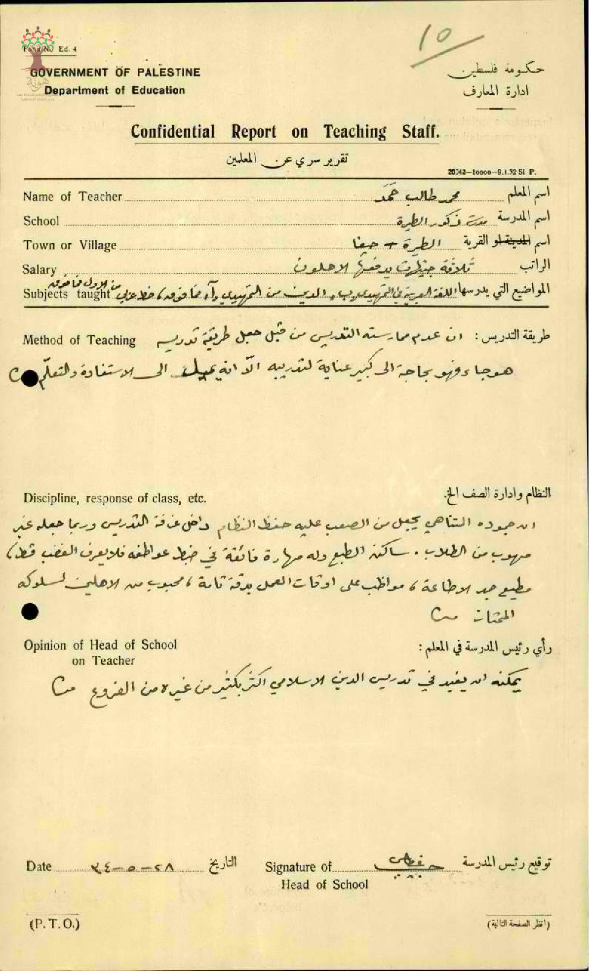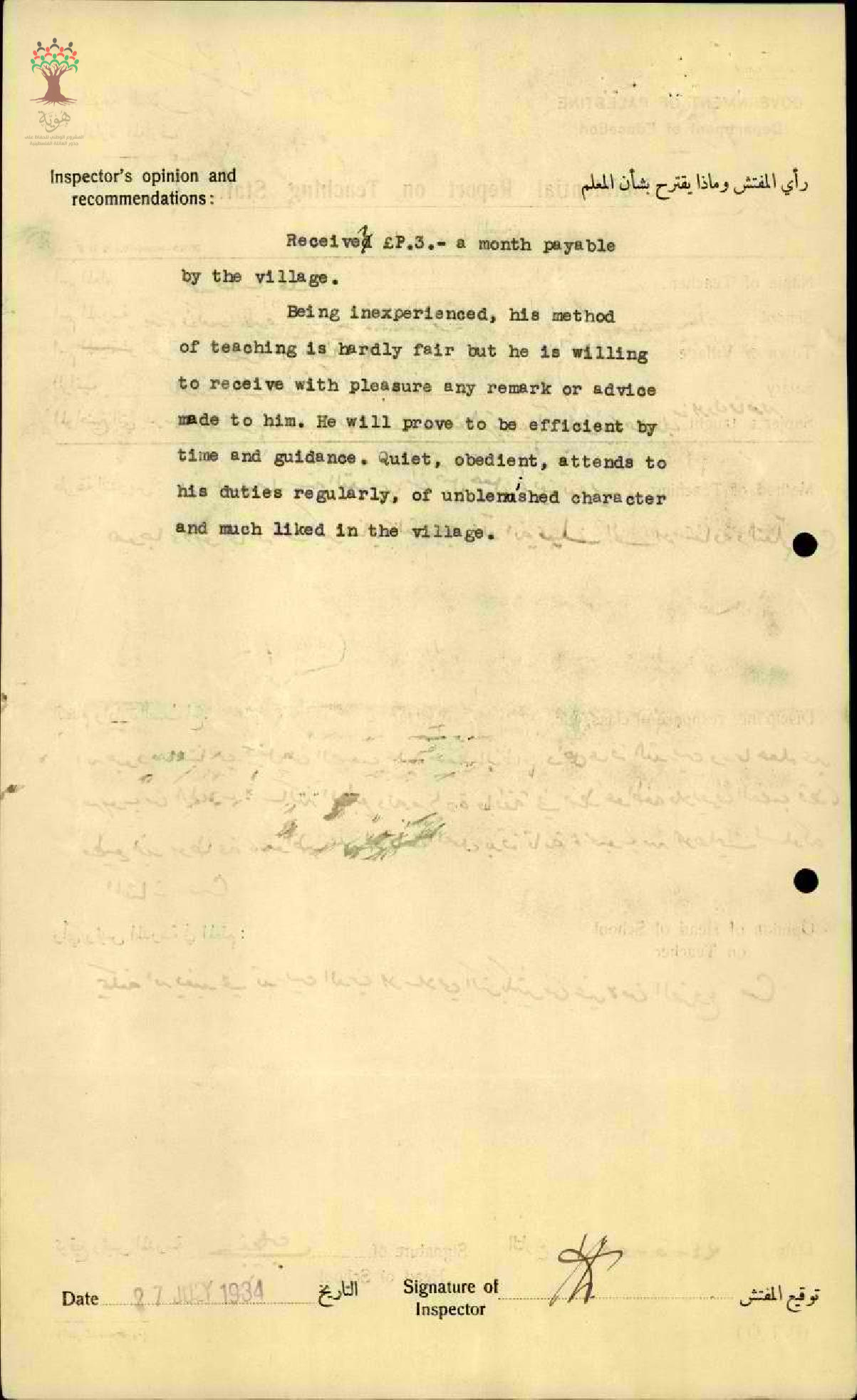 تقرير تفصيلي عن أداء المعلم محمد طالب حمد في مدرسة الطيرة للبنين سنة 1934