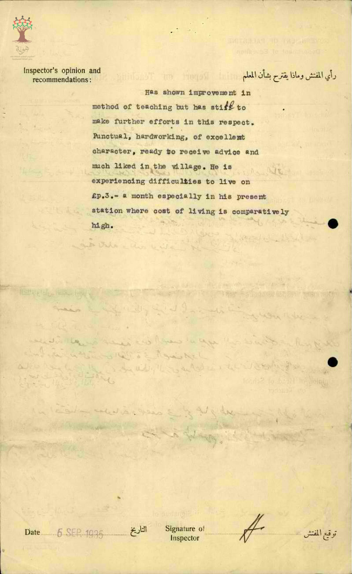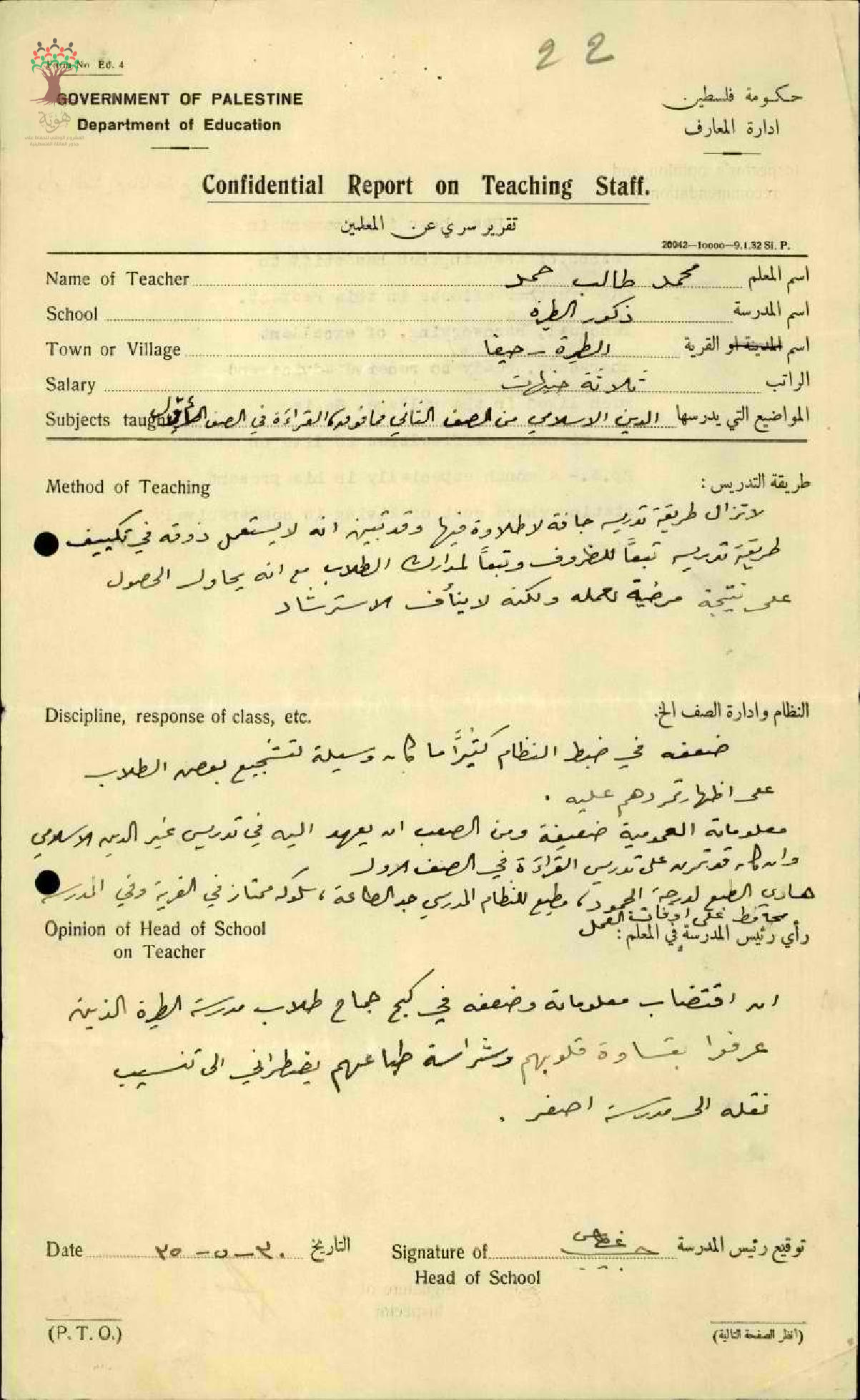 تقرير تفصيلي عن أداء المعلم محمد طالب حمد في مدرسة الطيرة للبنين سنة 1935